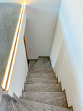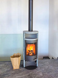 1. Etage (Hanglage): Eingang, Garderobe. Sehr schöner, großzügig bis in den Dachgiebel ausgebauter Wohnraum (38 qm) mit großer Panoramafensterfront, gemütlicher Sitzgruppe am Kaminofen, Esstisch, Einbauküche (Backofen, Mikrowelle, Spülmaschine), Terrasse. Separates WC.