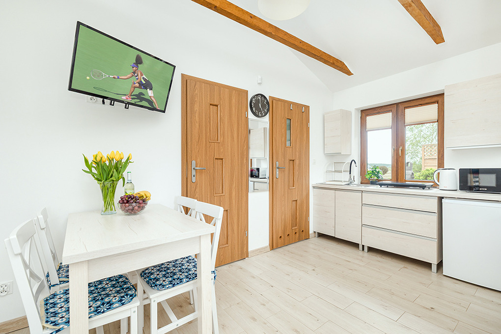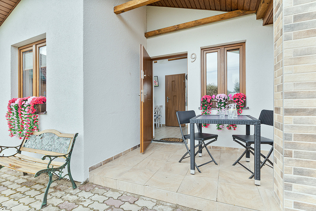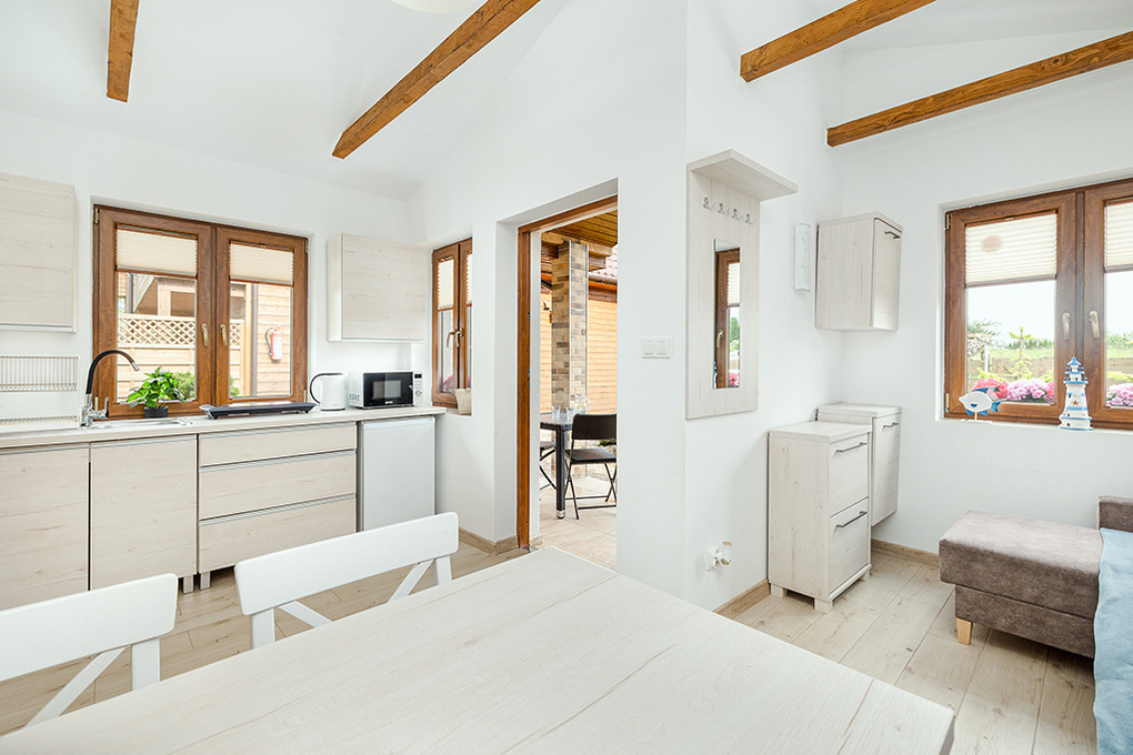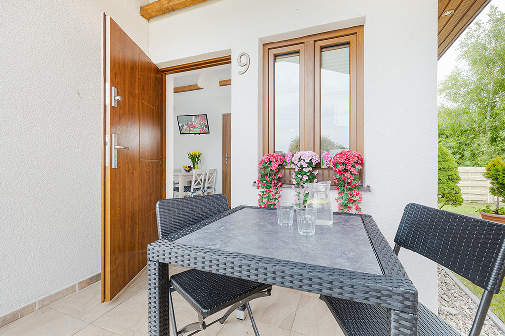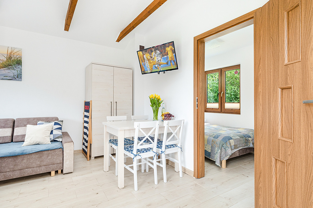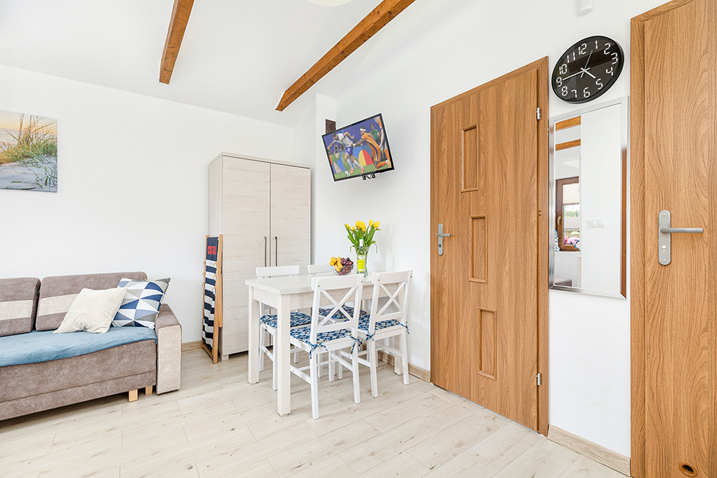 Ort: Chlopy. 5,5 km westlich vom Ostseebad Mielno und 2 km östlich von Sarbinowo ist Chlopy ein aufstrebendes und interessantes Fischerdorf mit zunehmender touristischer Infrastruktur. Ruhige Lage in einer Seitenstraße 850 m vom Ostseestrand entfernt. Einkaufmöglichkeiten 700 m (Mai-Sept). Supermarkt 1,5 km. Ortsmitte mit Strandpromenade, Cafés 800 m. Restaurants 700 m. Seebrücke, Fischkutter und Räucherei 900 m. Museum "Skarbnica" mit Ausstellung von historischem Angelboot und Gegenständen des historischen Alltages der Dorfbewohner und Fischer aus dem 18. und 19. Jahrhundert 650 m. Mielno mit lebhafter Strandpromenade, Segelhafen und Bootsverleih am Jamno See 5,5 km. Öffentliches Hotelhallenbad mit Wellnessbereich, Sauna, Solebecken, Innen- und Außenwhirlpool 6,4 km. Köslin mit Einkauszentren und Aqua Park 17 km. Freizeitpark Pomerania Fun Park 31 km.