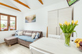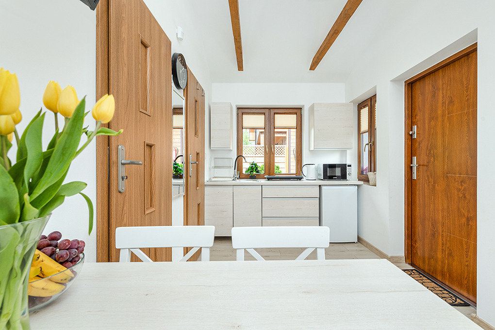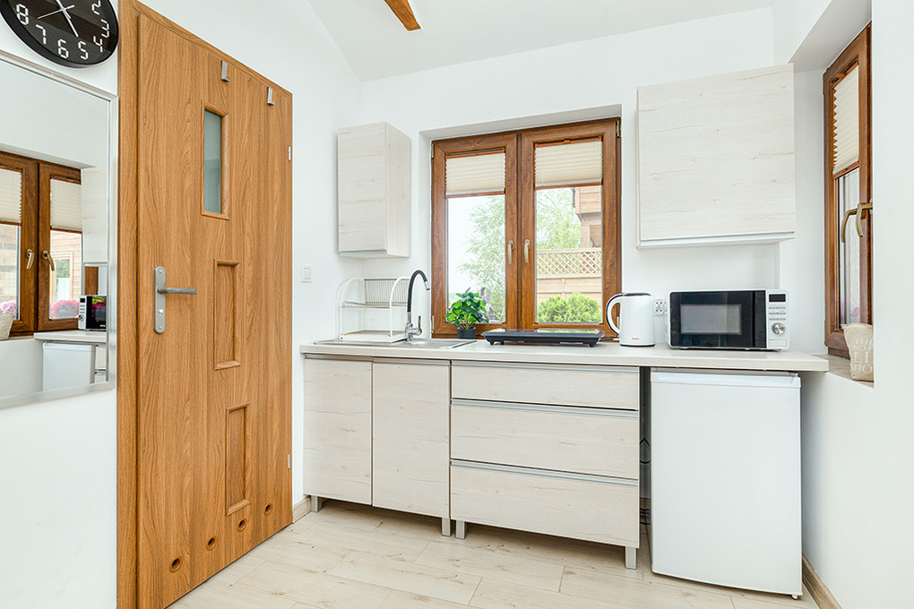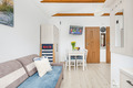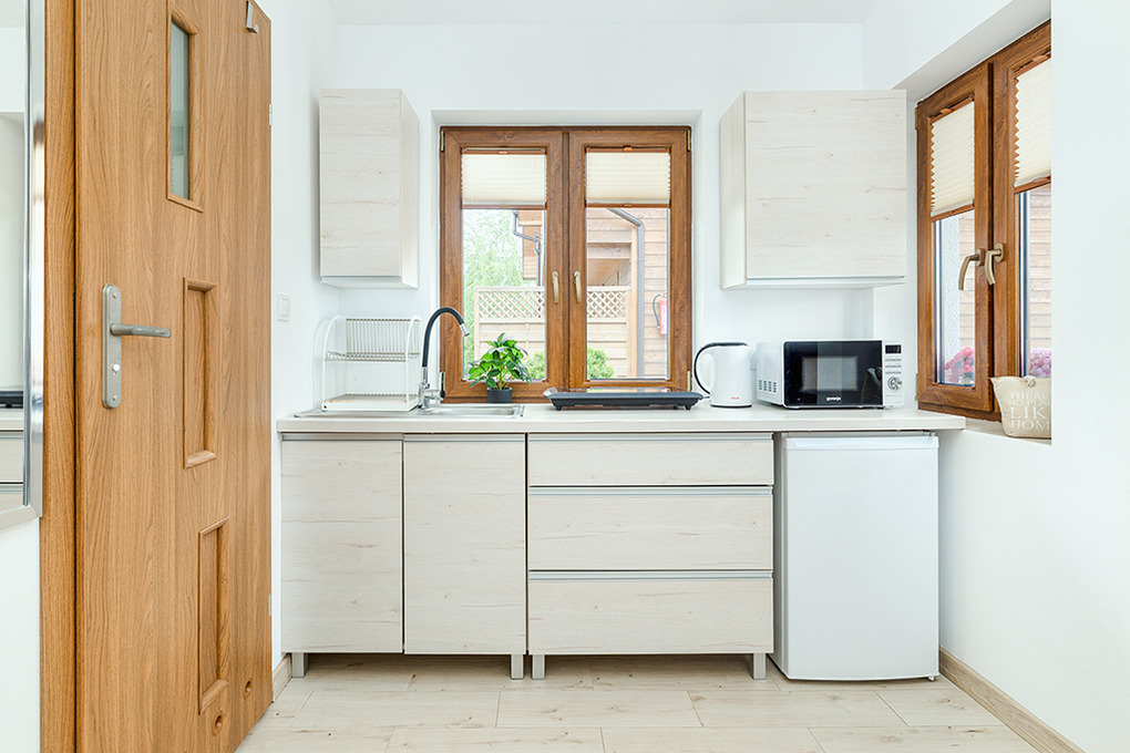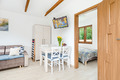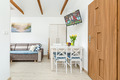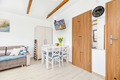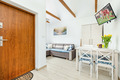 PL 56.5 Ferienhaus 2-4 Pers.: Schön eingerichtetes 2-Zimmerhaus mit 22 qm Wohnfläche. Parterre: Heller Wohn-/Essraum mit Holzbalkendecke, Couch (Klappcouch 2 Pers.), Flachbild SMART-TV, Esstisch, kleiner Küchenzeile (2 E-Platten Induktion, Mikrowelle). Doppelzimmer. Bad: Du, Wb, WC. Überdachter Terrasse mit Sitzmöbeln, schönem Ausblick auf den davorliegenden Garten.