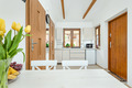 Schönes Ferienhaus mit geschmackvoller Einrichtung. E-Heizung a.W. Warmwasser über Durchlauferhitzer. Teilüberdachte Terrasse mit Sitzmöbeln, schönem Blick auf den davorliegenden Garten. 1 Parkplätze/Ferienhaus im Mietpreis enthalten.