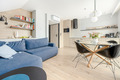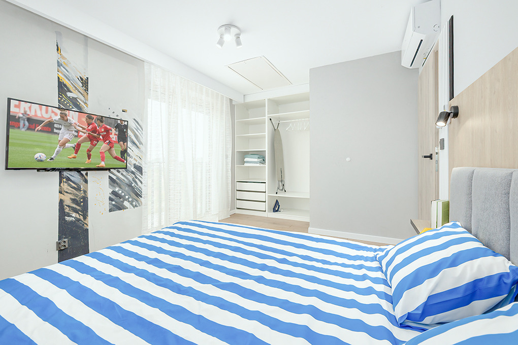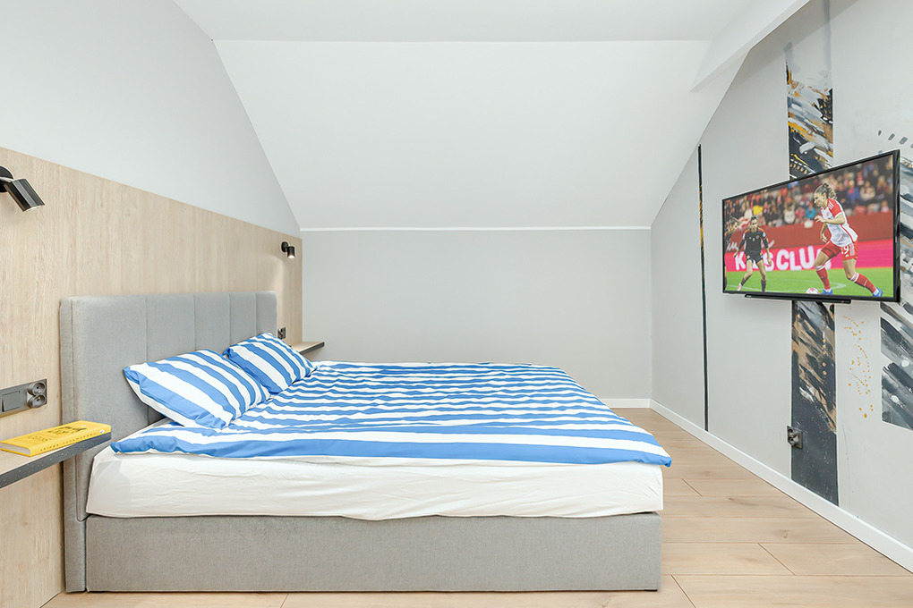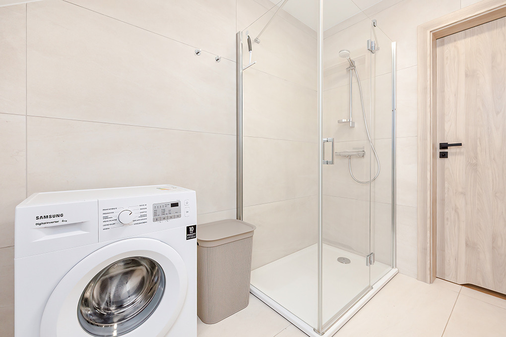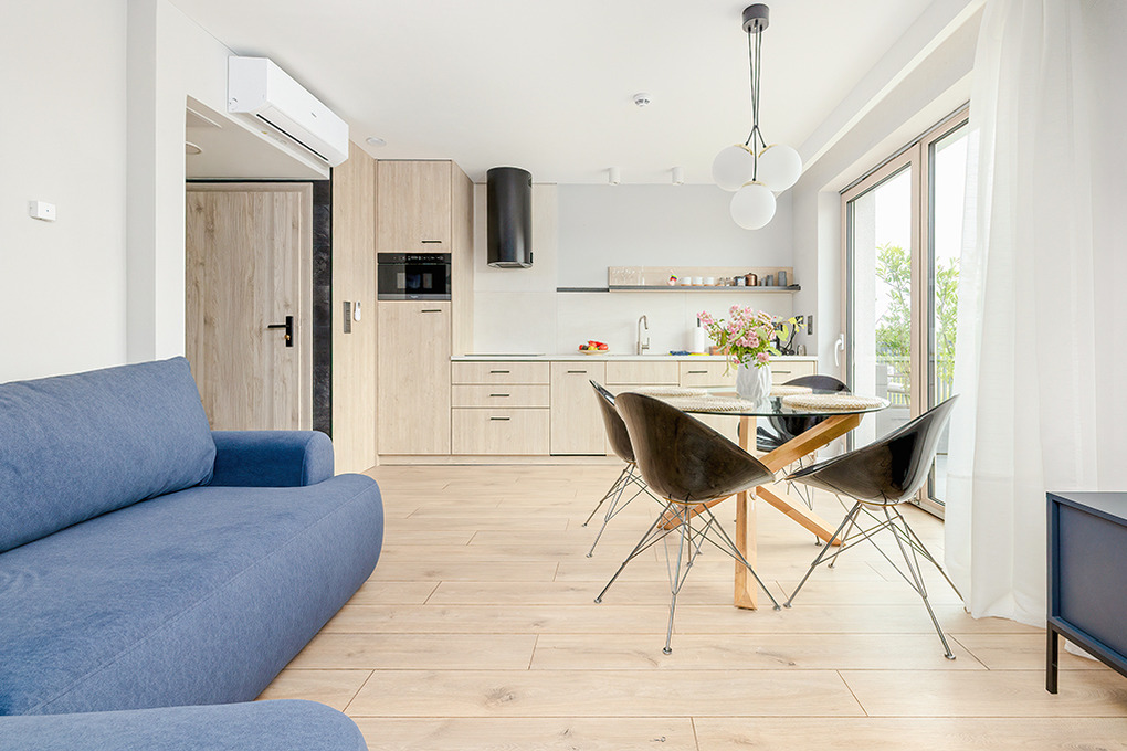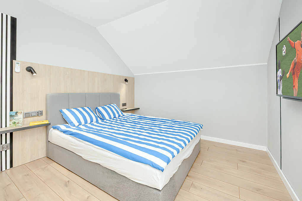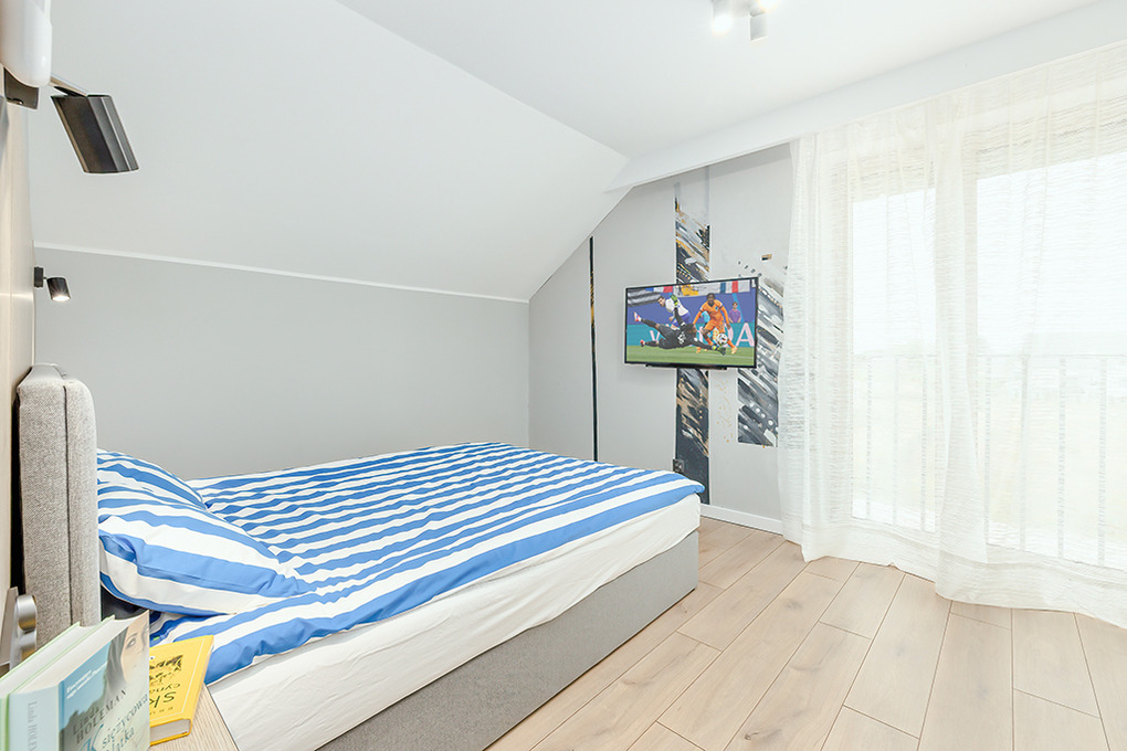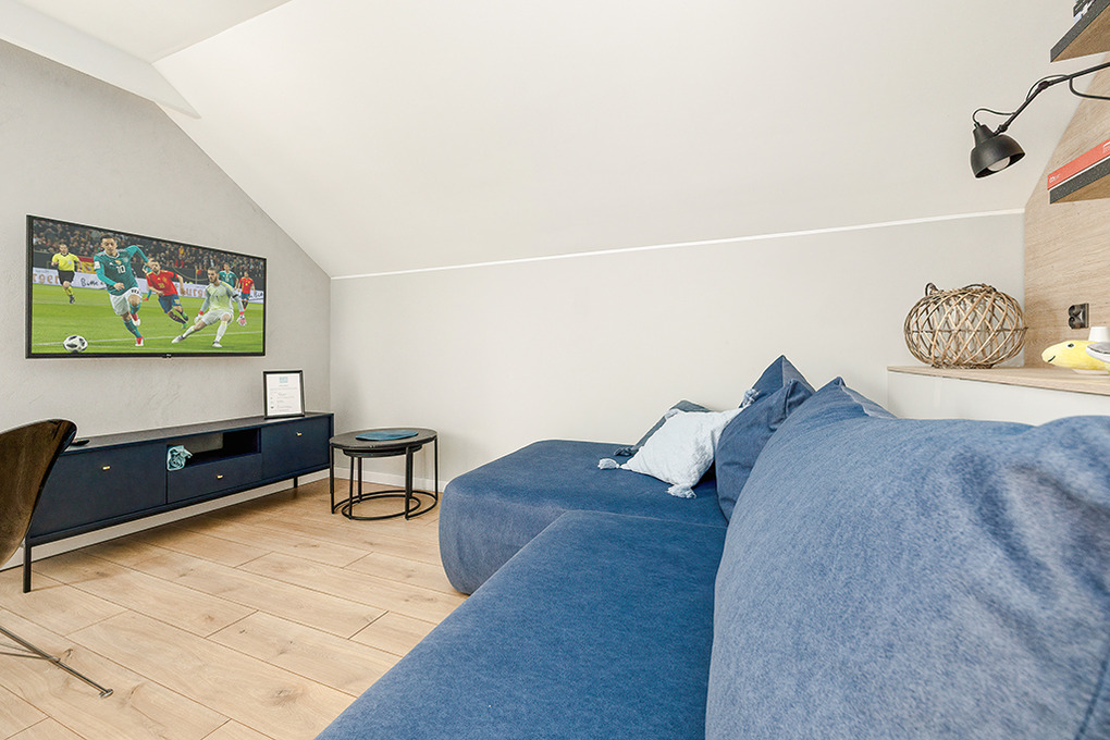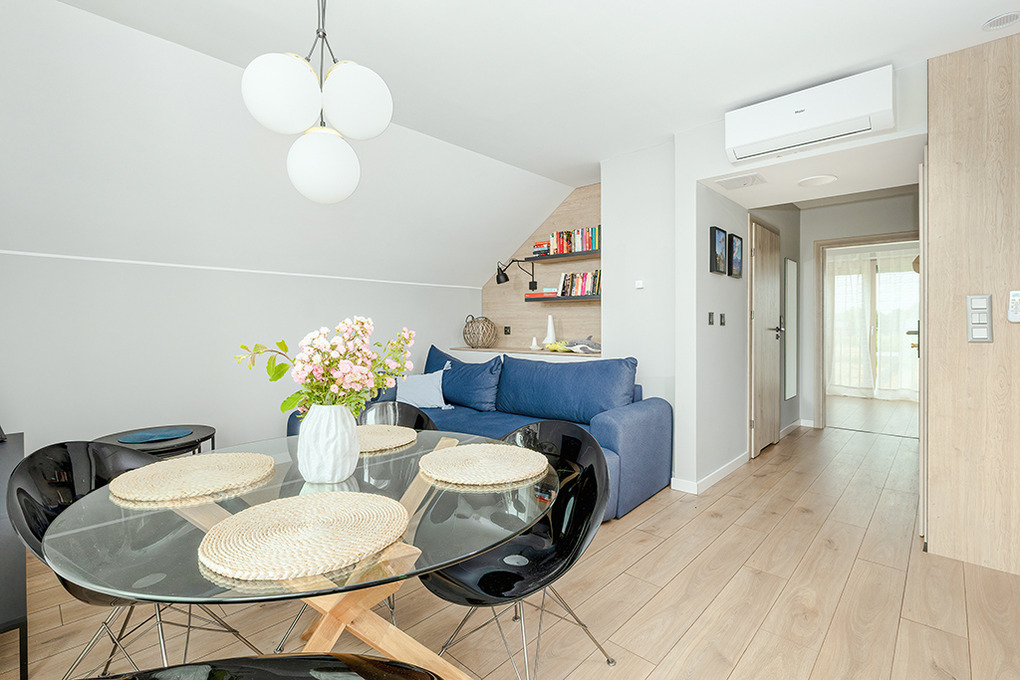 Sehr geschmackvoll und hochwertig eingerichtete 2-Zimmerwohnung mit 49 qm Wohnfläche, 1. Etage. Wohn-/Essraum mit Couchgarnitur (Ausziehsofa 2 Pers.), bodentiefe Fenster, Flachbild SMART-TV, Internet (WLAN), Klimaanlage, Esstisch, moderner Küchenzeile (4 E-Platten Induktion, Dunstabzugshaube, Einbaubackofen mit integrierter Mikrowelle , Spülmaschine). Doppelzimmer mit SMART-TV und Klimaanlage. Bad: Du, Wb, WC, Waschmaschine. Balkon mit Sitzmöbeln, seitlichem Blick auf den Wrzosowski See.