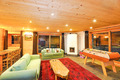 Parterre: Aufenthaltsraum mit Sofa-Sitzgruppe am Kamin, Kicker, Sitzecke, Küchenzeile, Terrasse. Großes Doppelzimmer mit Du, 2 Wb, separatem WC.