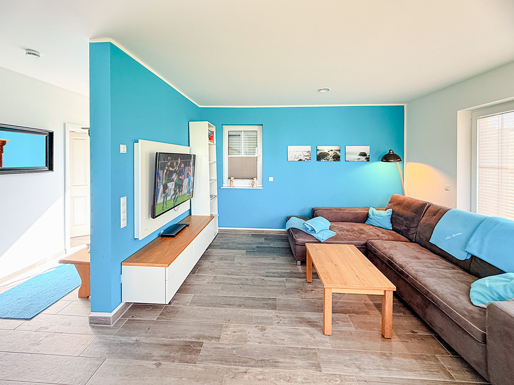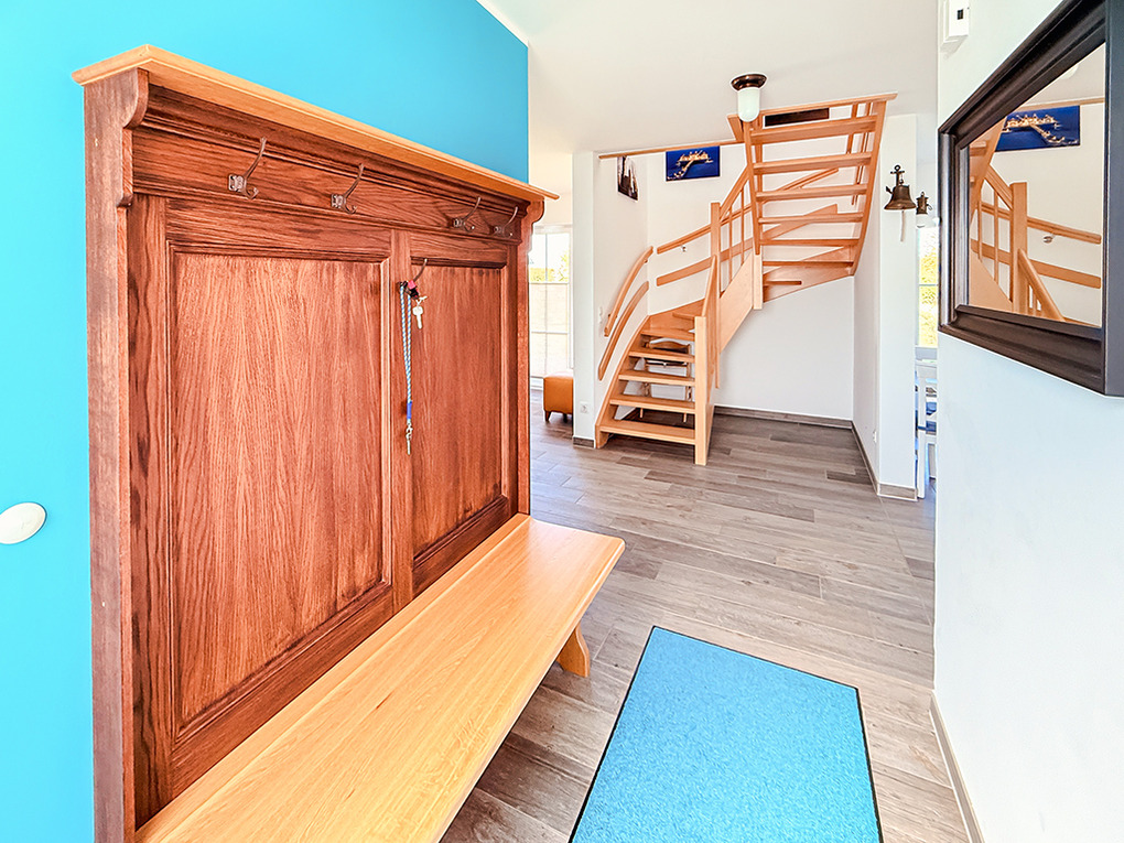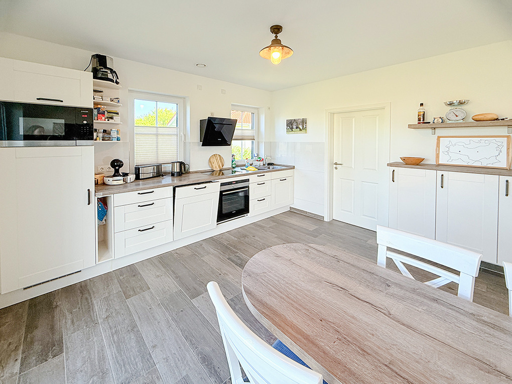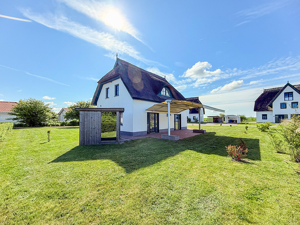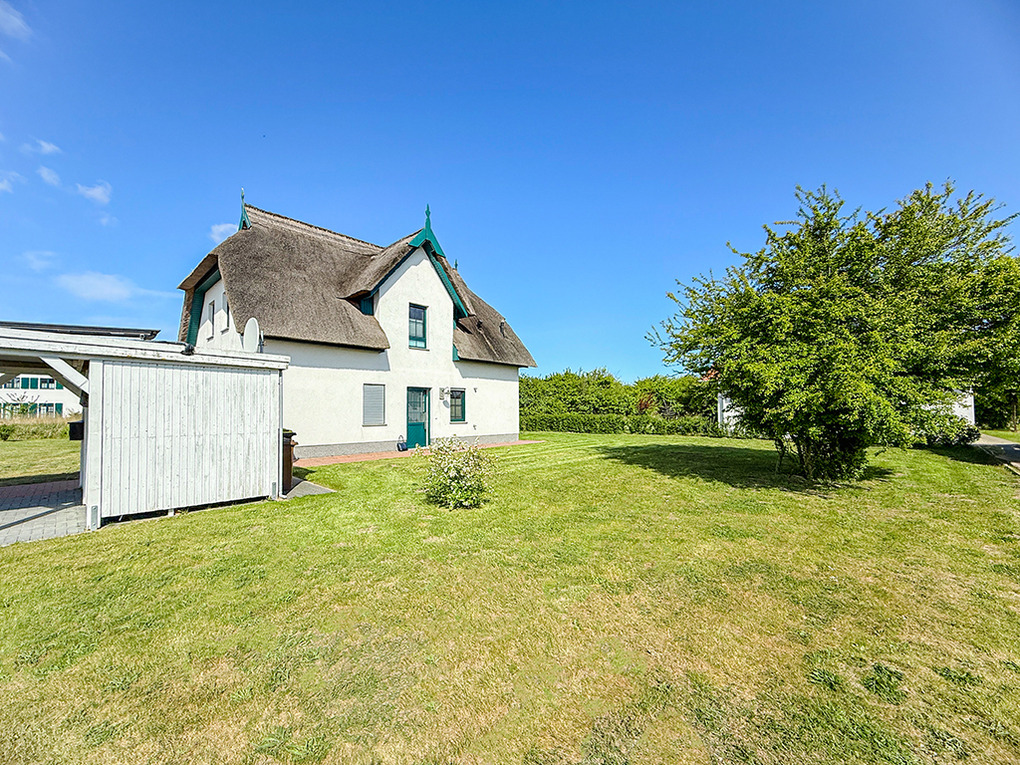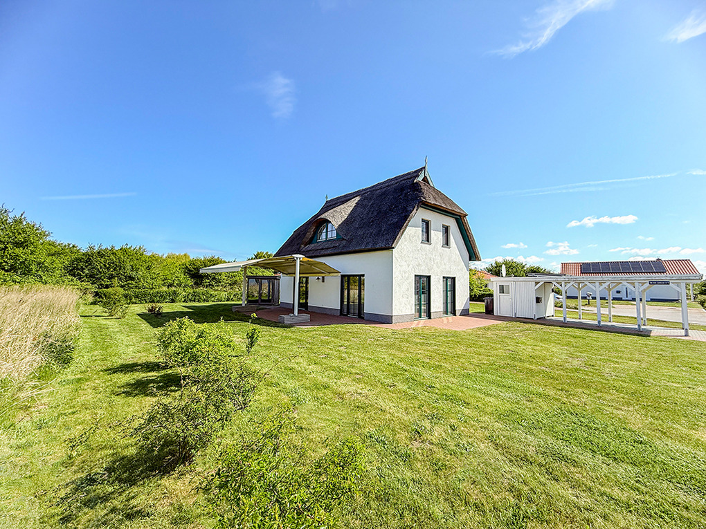 Haus: Exklusives Reetdachhaus mit Sauna und Garten. Großzügiges Ferienhaus mit komfortabler Ausstattung und hochwertiger Möblierung. Kostenloser Internetzugang (W-Lan). Zentralheizung. Terrasse mit Sitzmöbeln, Markise. Tiroler Zirbensauna im Außenbereich. Großer Garten mit Rasenfläche (500 qm). Carport für 1 Pkw. Ein weiterer Stellplatz am Haus. Ladestation für E-Autos (Gebühr).