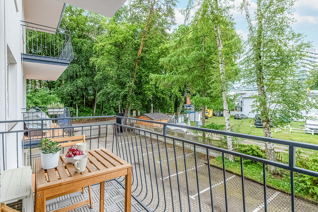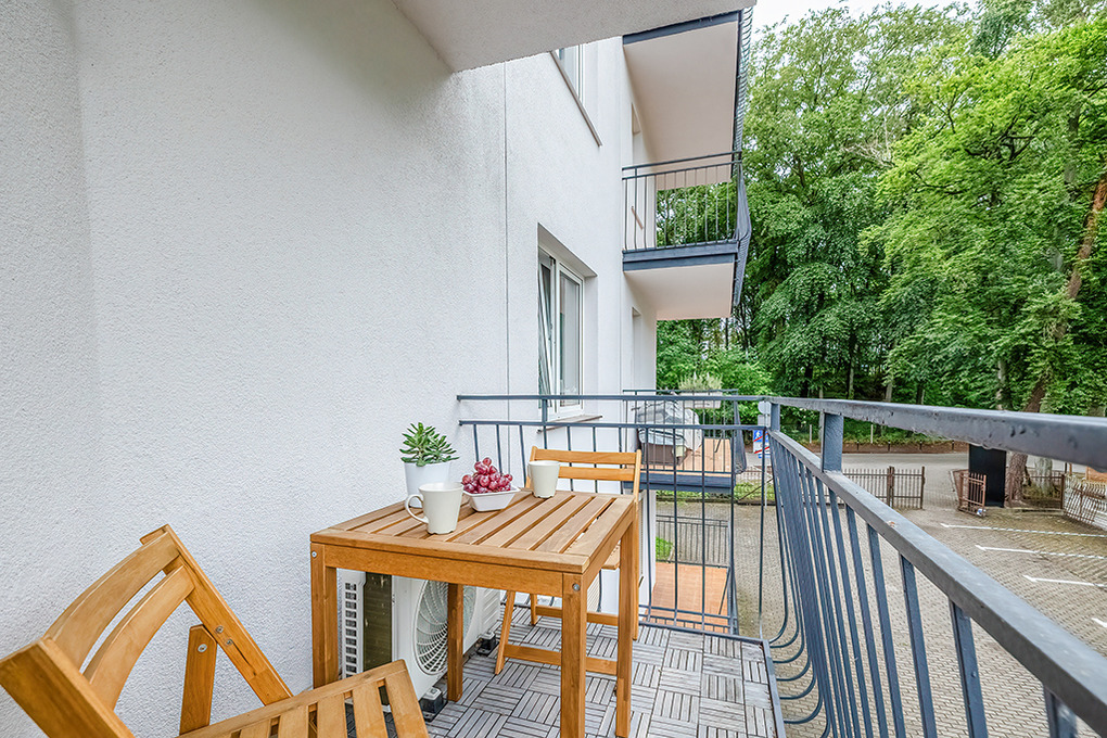 Ort: Ostseebad Miedzyzdroje (Misdroy). Erstklassige, ruhige Lage am Ortsrand. Ostseestrand 150 m. Einkaufen, Restaurant 400 m. Ortsmitte mit Geschäften, Cafés 800 m. Seebrücke 1,3 km. Hotelhallenbad mit Sauna, Wellnessbereich 250 m. Skatepark 600 m, Ozeanarium 1,1 km. Supermarkt 1,1 km. Hochseilgarten 1,2 km. Wisent Gehege 3 km. Wollinski Nationalpark 8 km.