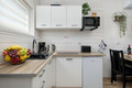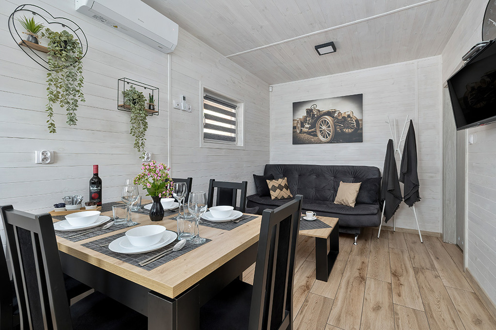 PL 12.60 Ferienhaus 2-6 Pers.: Niveauvolles 3-Zimmerhaus mit 65 qm Wohnfläche über 2 Etagen. Parterre: Schöner Wohn-/Essraum mit Sofa (Klappcouch 2 Pers.), Flachbild Sat-TV (deutsche Programme), Esstisch, Küchenzeile (2 Platten-Induktionsherd, Mikrowelle, Tiefkühlfach 15 l). Doppelzimmer. Bad: Du, Wb, WC. Steile Holztreppe ins Dachgeschoss mit Schrägen: offenes Vierbettzimmer mit Doppelbett und Einzelbetten, Blick auf den wunderschön angelegten Garten und Pool.