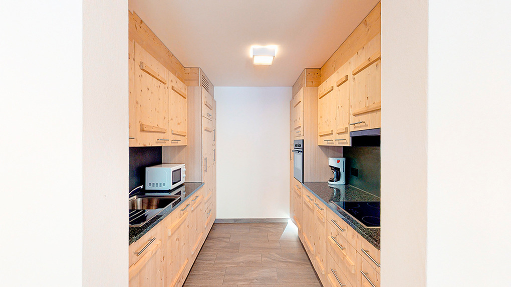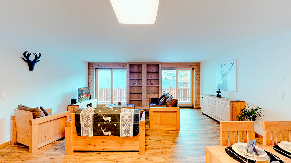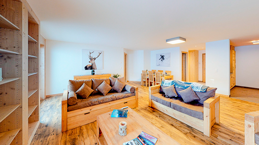 CH 385.43 Wohnung 6-8 Pers.: 4 Zimmer, 125 qm. Großer Wohnraum mit Sitzgruppe (Schlafsofa 2 Pers.), TV, Esstisch, Küchenzeile. Doppelzimmer mit Bad (Bw/Du, Wb, WC). Zwei Doppelzimmer. Bad: Du, Wb, WC.