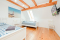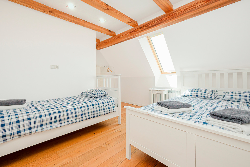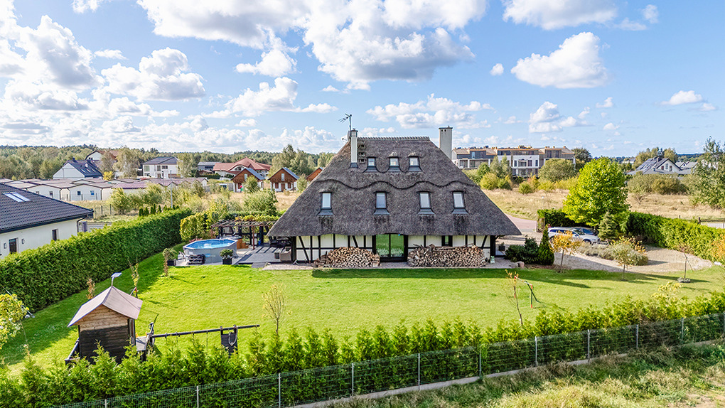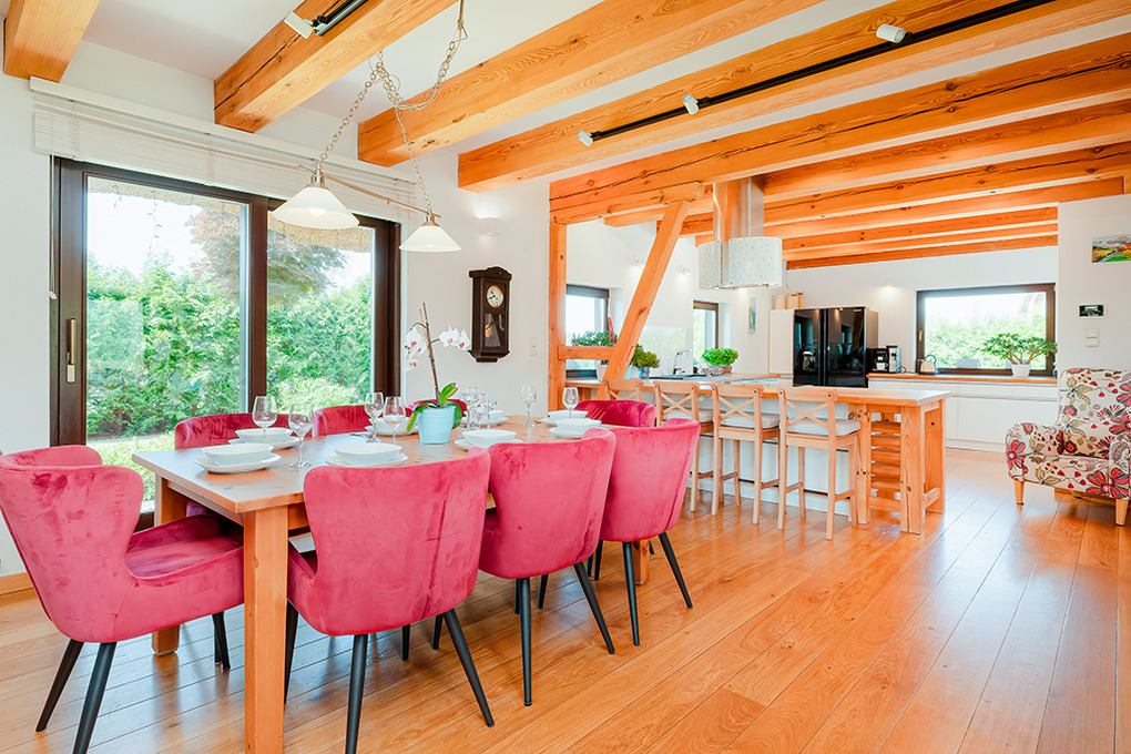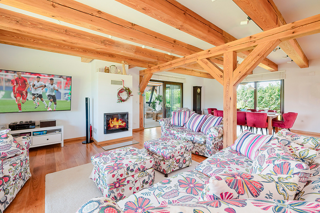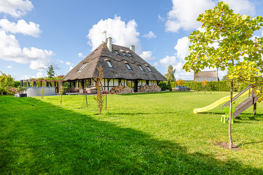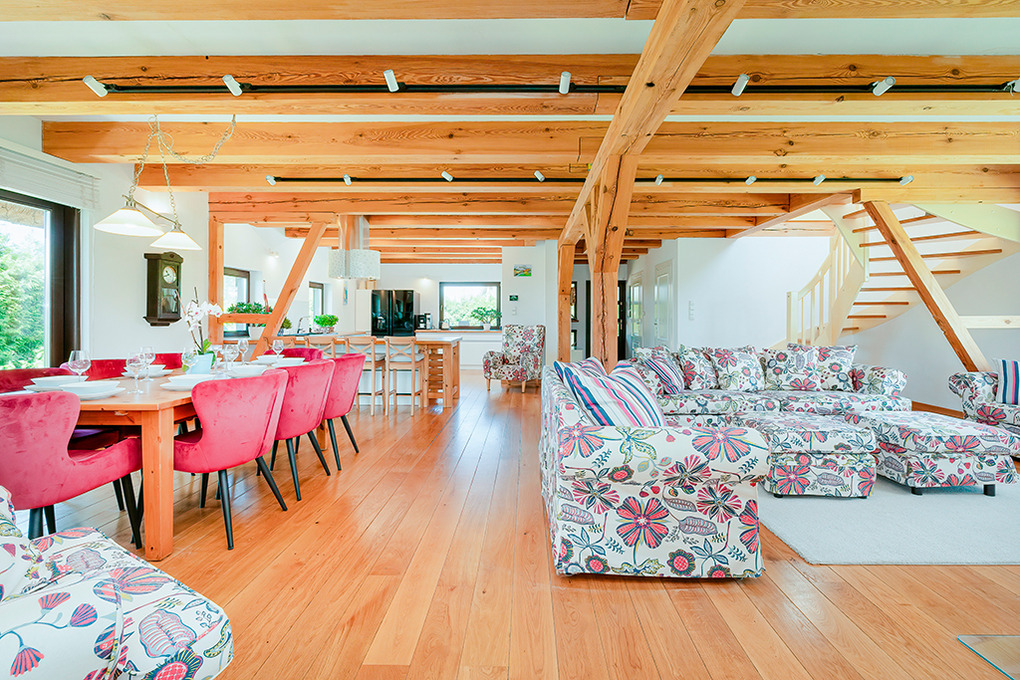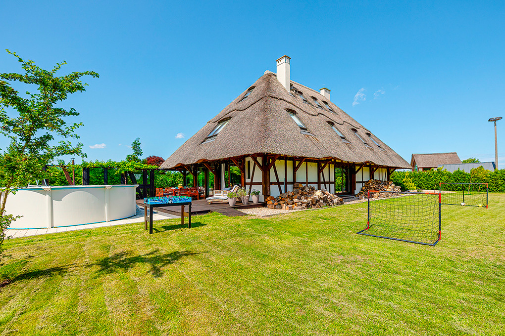 PL 85.12 Ferienhaus 4-15 Pers.: Stilvolles, luxuriöses, großzügiges 6-Zimmer-Ferienhaus mit 300 qm Wohnfläche über 2 Etagen. Parterre: Sehr komfortabler, lichtdurchfluteter Wohn-/Essraum mit rustikaler Holzbalkendecke, Kamin vor gemütlicher Sofa-Ecke (Ausziehcouch 2 Pers. 160 cm Breite), Couchtisch, Flachbild SMART-TV, großem Esstisch. Moderner, offener, sehr gut ausgestatteter Küchenbereich mit 4 Platten Induktionsfeld, Backofen, Mikrowelle, Abzugshaube, großer Kühlgefrierkombination, professionelle Kaffeemaschine, Weinregal, Spülmaschine. Modernes Bad mit ebenerdiger Dusche, Wb, WC. Sehr schöner Saunabereich: finnische Sauna/Dampfbad. Schönes Bad mit Regendusche, Wb, WC. Davor Ruheraum mit Sitzmöbeln, großer TV-Leinwand im Glas-Wintergarten mit herrlichem Blick in den großen Garten. Vom Wohnraum Holztreppe in die 1. Etage (Dachgeschoss): Offene Galerie mit Sofa (Ausziehcouch 2 Pers. 180 cm Breite), 2 Sesseln. Modernes Doppelzimmer. 2 schöne 3-Bettzimmer davon eins mit Doppelbett, Einzelbett, eins mit 3 Einzelbetten, ein Zimmer davon mit SMART-TV. 5-Bettzimmer mit Doppelbett, Einzelbett, Schlafsofa (Ausziehcouch 2 Pers. 160 cm Breite). Stilvolles großzügiges Bad mit Badewanne, ebenerdige Dusche, 2 Wb, WC, Bidet. Große, teilüberdachte Terrasse mit Sitzmöbeln, davor im Garten Pool, Jacuzzi und Badefass. Storchennest auf dem Grundstück. Achtung: die maximale Belegung darf 15 Personen nicht überschreiten.