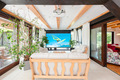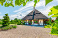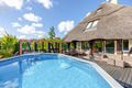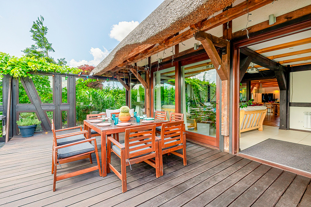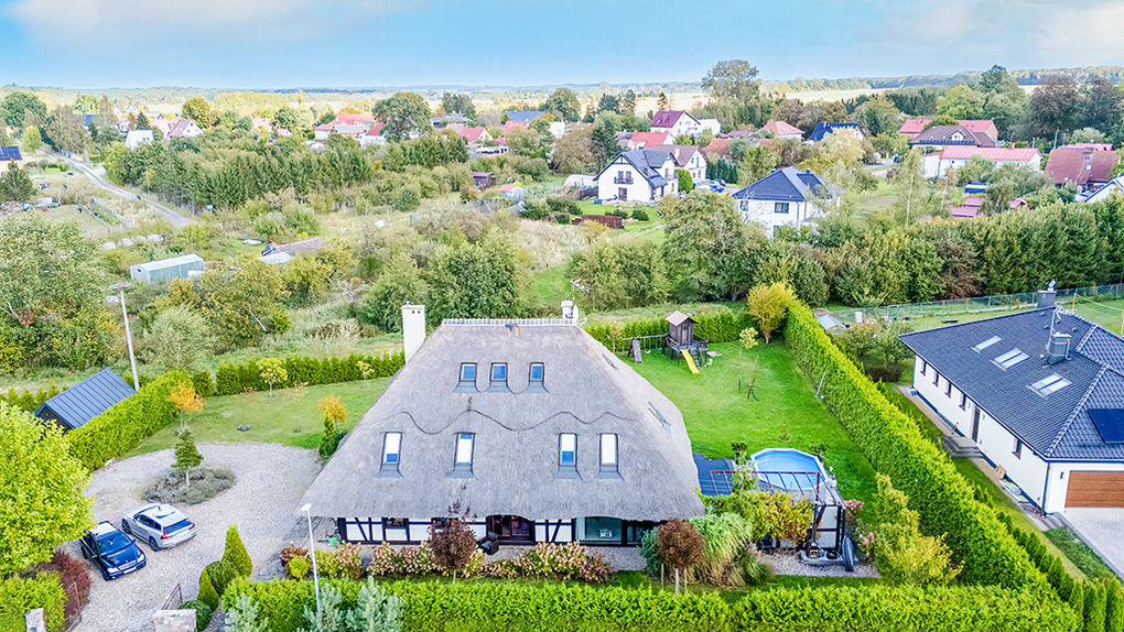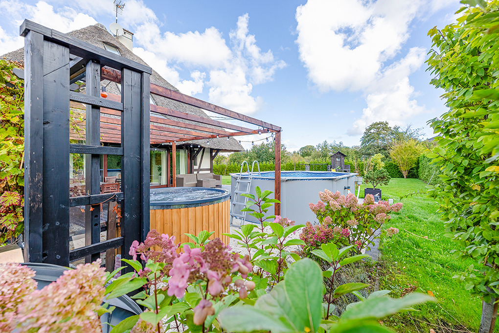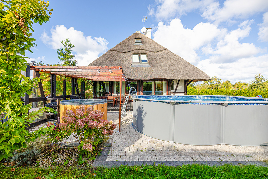 Haus: Sehr exklusives Reetdachhaus mit Pool, Sauna, Jacuzzi, Badefass und Kamin auf einem sehr großen Gartengründstück (2000 qm). Sehr schönes Ferienhaus mit Seltenheitswert! Nichtraucherhaus. Großzügiges Platzangebot auf 300 qm Wohnfläche. Schöner Wintergarten mit Gartenblick. Gehobene Ausstattung, vom Eigentümer mit Liebe zum Detail modern eingerichtet. Kostenloses Internet über WLan. Heizung über Zentralheizung, Kamin. Im Wohnzimmer Fußbodenheizung. Warmwasser über E-Boiler (400 l). Terrasse mit Sitzmöbeln, Grill. Großer, gepflegter Garten mit Pool, Jacuzzi, Holz-befeuertem Badefass, kleinem Spielplatz mit Rutsche, Schaukel, Trampolin. 4 Pkw-Stellplätze auf umzäuntem Grundstück.
