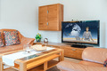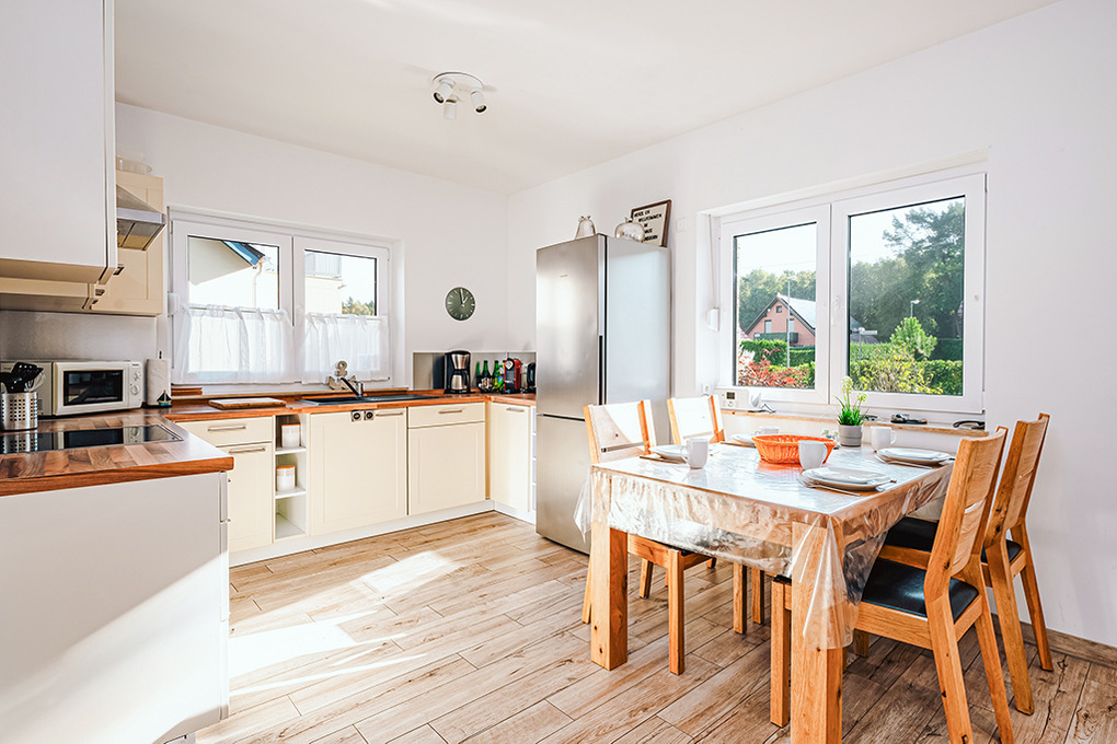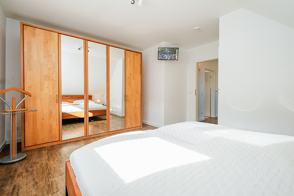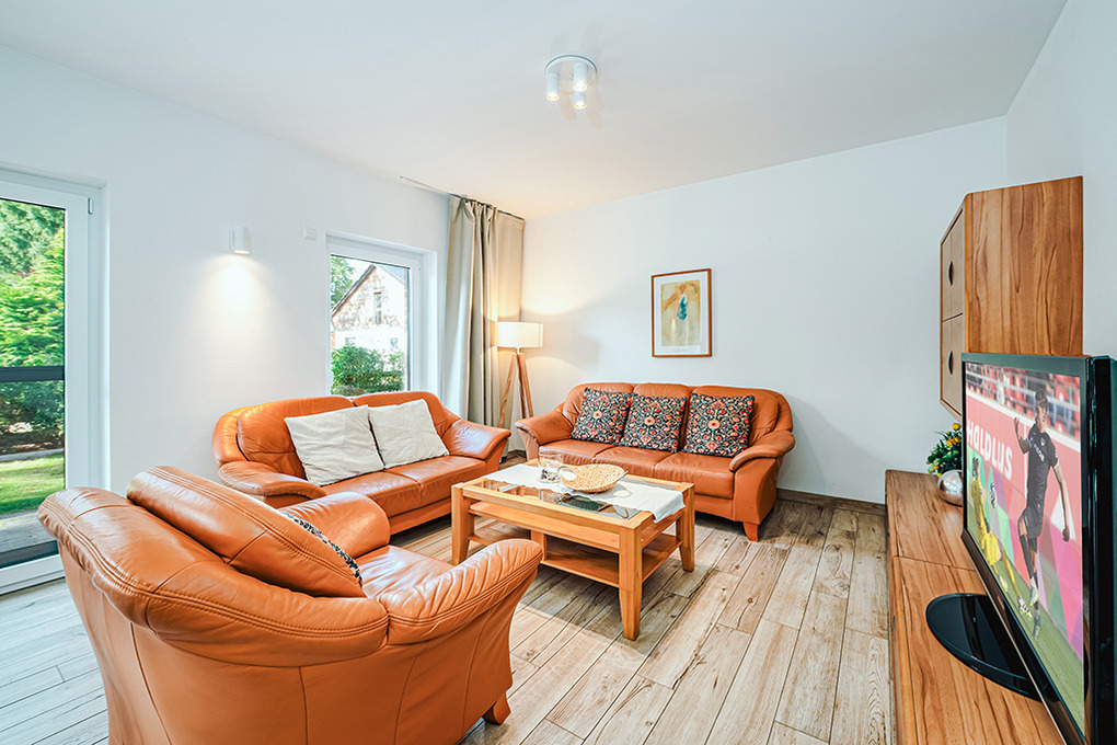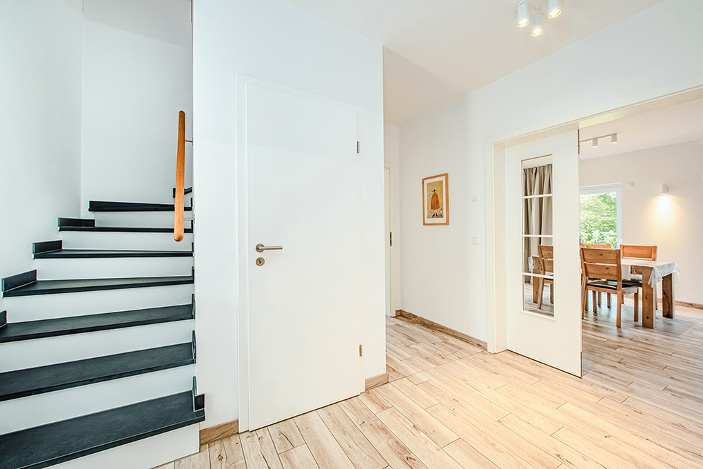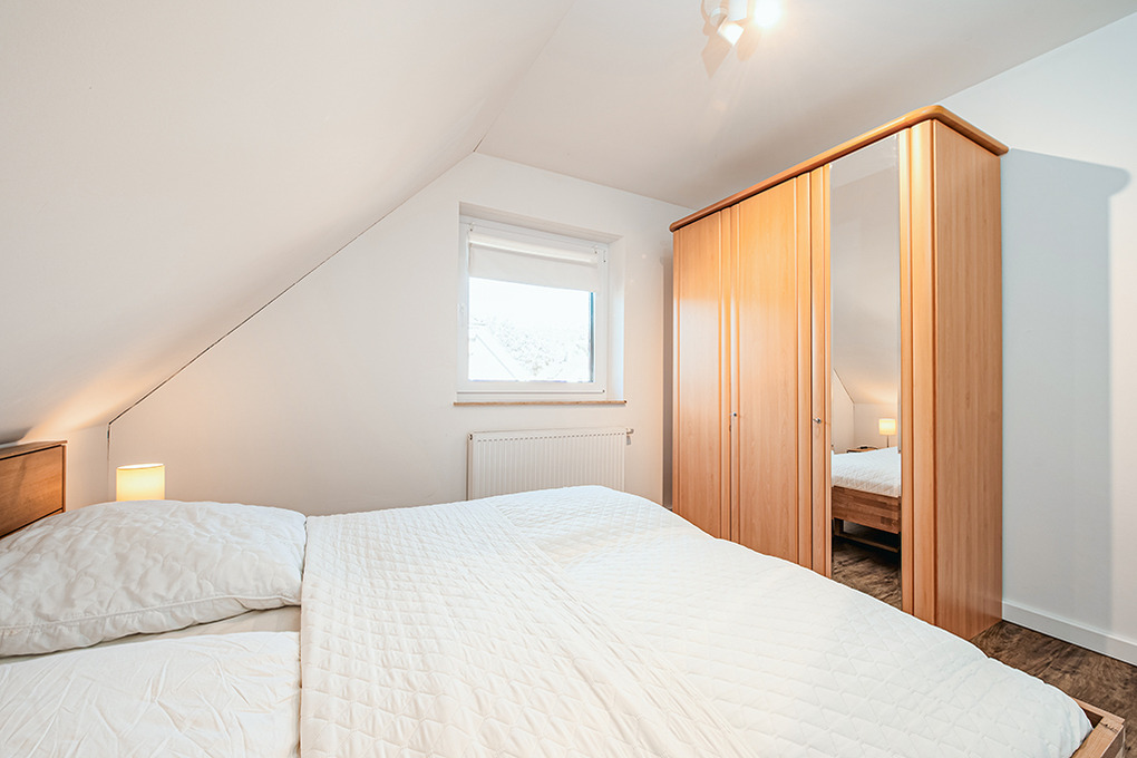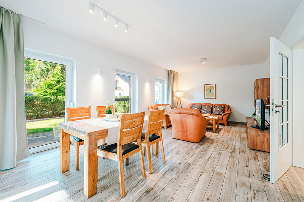 D 120.31 Ferienhaus 2-6 Pers.: Ansprechendes 4-Zimmerhaus mit 123 qm Wohnfläche über 2 Etagen. Parterre: Gemütlicher Wohn-/Essraum mit Kaminofen, Couchgarnitur, Sat-TV, Esstisch, sehr gut ausgestatteter Einbauküche (Backofen, Mikrowelle, Spülmaschine). Bad: Du, Wb, WC. Abstellraum mit Waschmaschine, Trockner. 1. Etage: Zwei Doppelzimmer mit Sat-TV. 2-Bettzimmer. Bad: Bw, Du, Wb, WC.