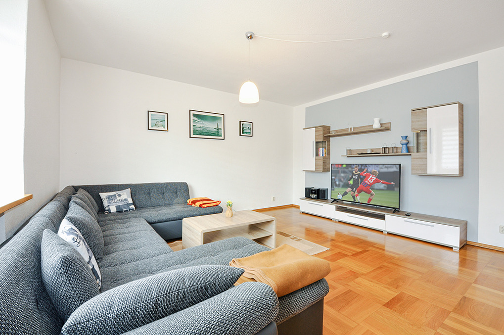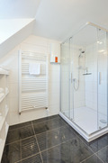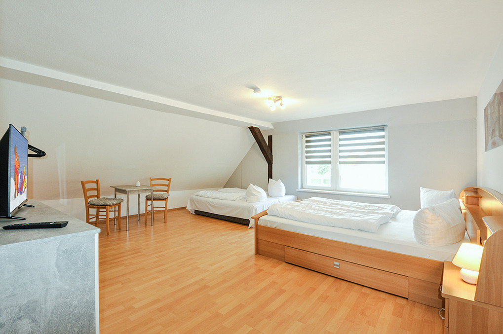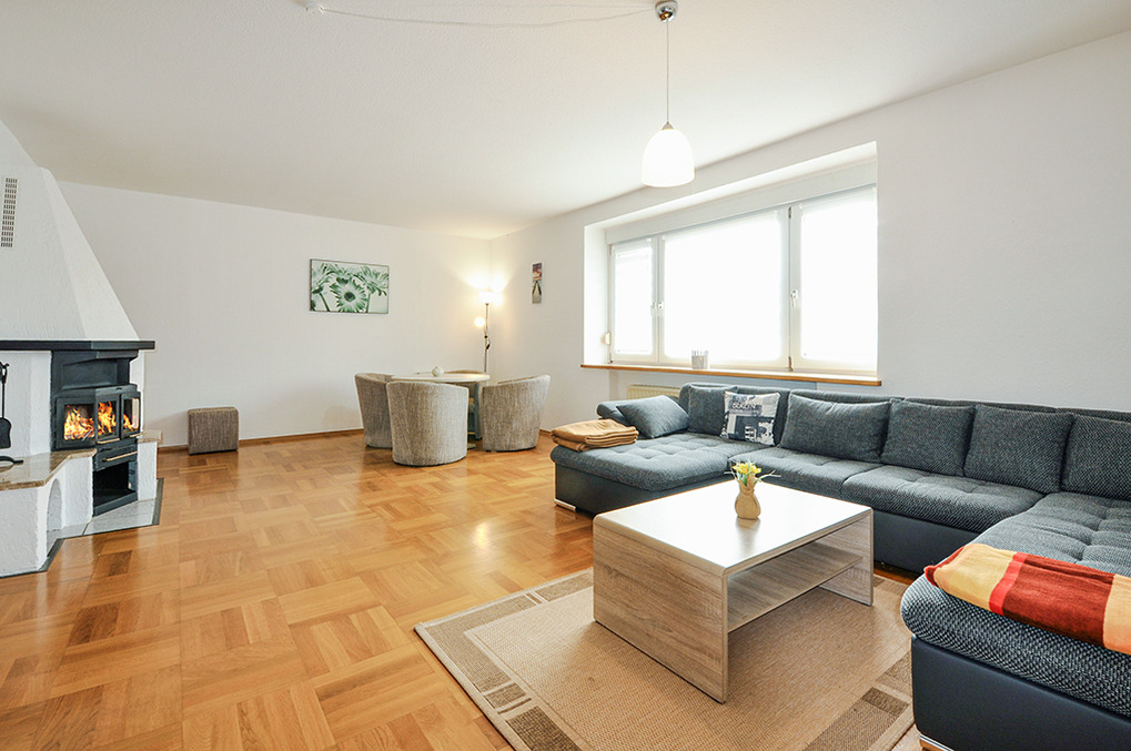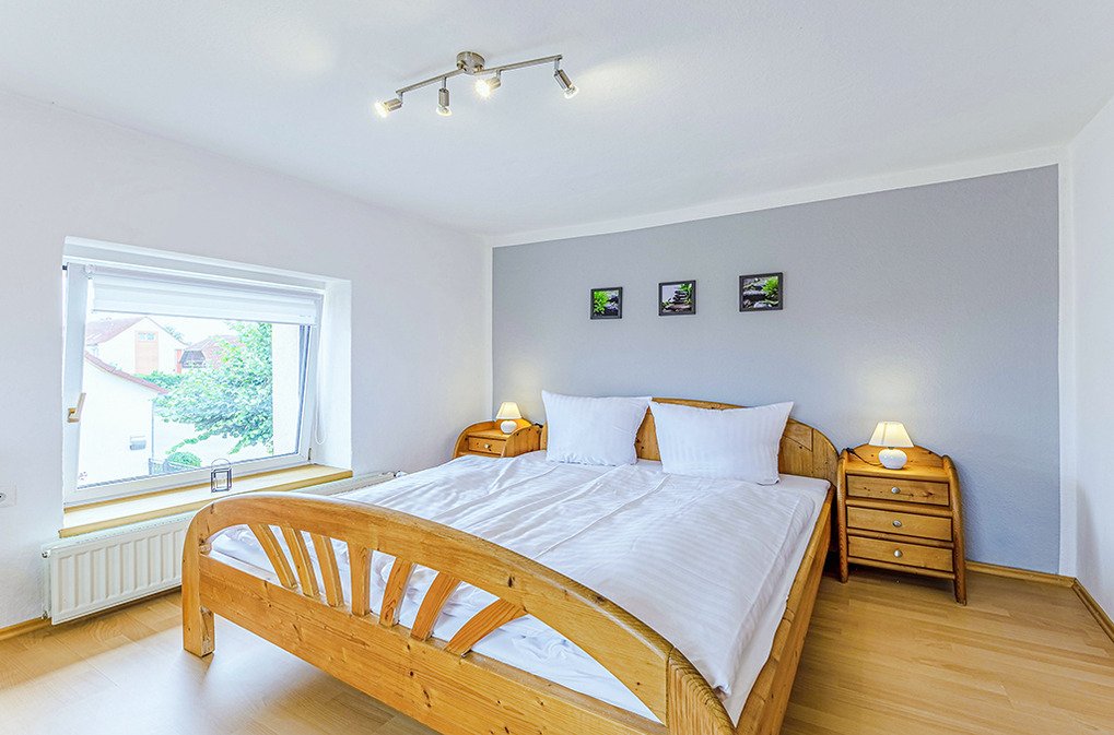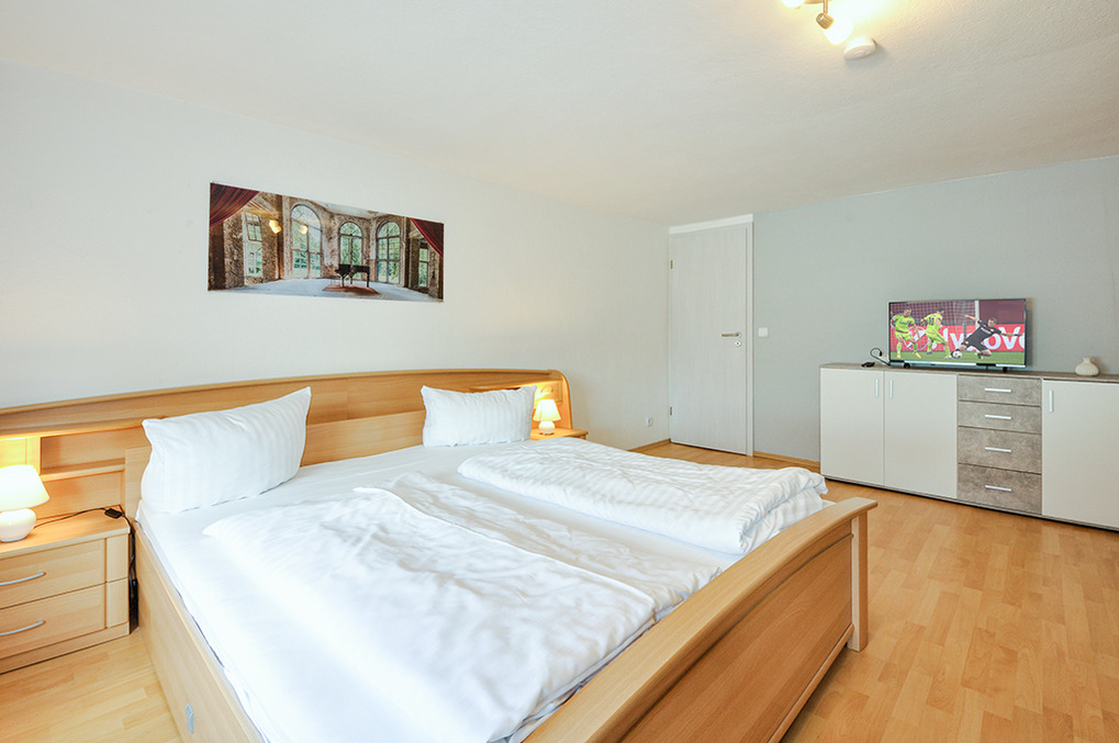D 46.193 Ferienhaus 4-10 Pers.: 5 1/2-Zimmerhaus mit 140 qm Wohnfläche über 2 Etagen. Parterre: Flur mit Garderobe. Großzügiger Wohnraum mit Couchgarnitur (Schlafsofa 2 Pers.), Kaminofen, Sat-TV, Sitzecke. Küchen-/Essraum mit großem Esstisch, moderner Küchenzeile (Backofen, Mikrowelle, Gefrierschrank, Spülmaschine). Bad: Eck-Badewanne, Wb, WC. 1. Etage (leichte Schrägen): 1-Bettzimmer. 2 schöne Doppelzimmer mit TV. Großes 4-Bettzimmer mit Doppelbett, Schlafsofa (2 Pers.), TV. Bad: Dusche, Wb, WC. Überdachter Balkon mit schönem Blick ins Grüne.