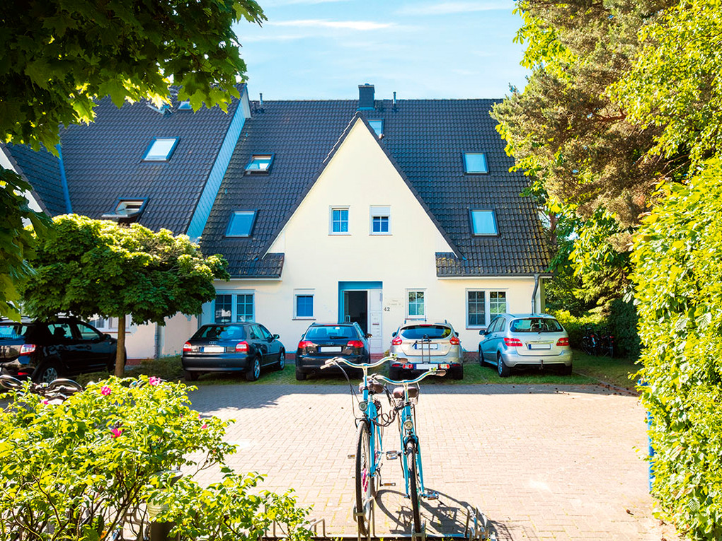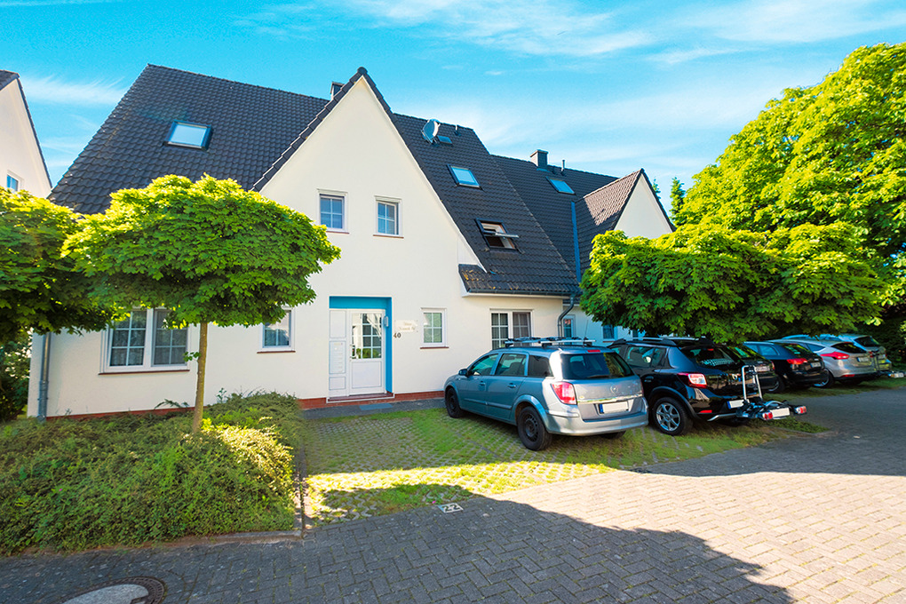 Ort: Ostseebad Zingst. Ruhige Lage in einer Wohnsiedlung in der Nähe des Kurmittelzentrums (150 m). Ortsmitte mit Einkaufsstraße 500 m. Ostseestrand 600 m. Bodden 500 m.