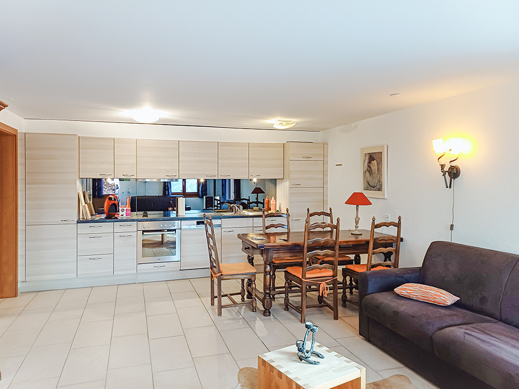 Haus: Schöne Chaletwohnung mit Kaminofen. Großzügiges Chalet mit 2 Wohnungen. Gemütliche Einrichtung, moderne Ausstattung. Internet kostenlos über W-Lan. Waschmaschine. Zentral-/Fußbodenheizung, Pellet-Kaminofen. 2 Pkw-Stellplätze am Haus.