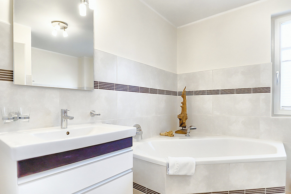 D 67.111 Ferienhaus 1-6 Pers.: Großzügige 4-Zimmerhaushälfte mit 100 qm Wohnfläche über 3 Etagen. Parterre: Heller, freundlicher Wohn-/Essraum mit gemütlicher Couchgarnitur, Kaminofen, Sat-TV (Smart-TV), Audioanlage mit Bluray-Player, Esstisch, moderner, gut ausgestatteter Einbauküche (Backofen, Mikrowelle, Spülmaschine, 2 Kaffeemaschinen für Filter und Kaffeepads) mit separatem Induktionskochfeld. Hauswirtschaftsraum mit Waschmaschine. Bad: Dusche, Waschbecken, WC. 1. Etage: Doppelzimmer mit Sat-TV. Weiteres Doppelzimmer. Großes Bad mit Eckbadewanne, barrierefreier Dusche, Waschbecken, WC. 2. Etage mit Dachschrägen: 2-Bettzimmer mit Sat-TV.