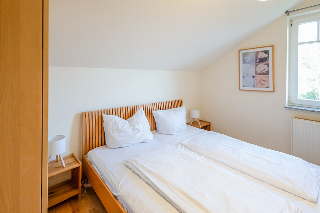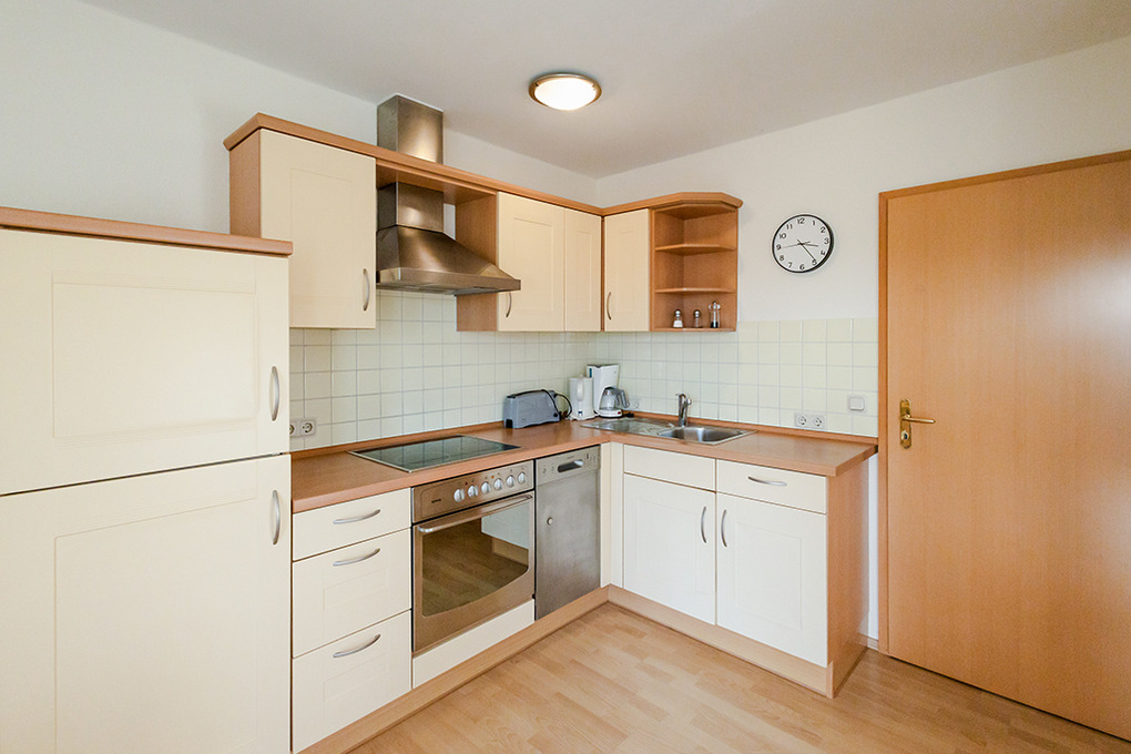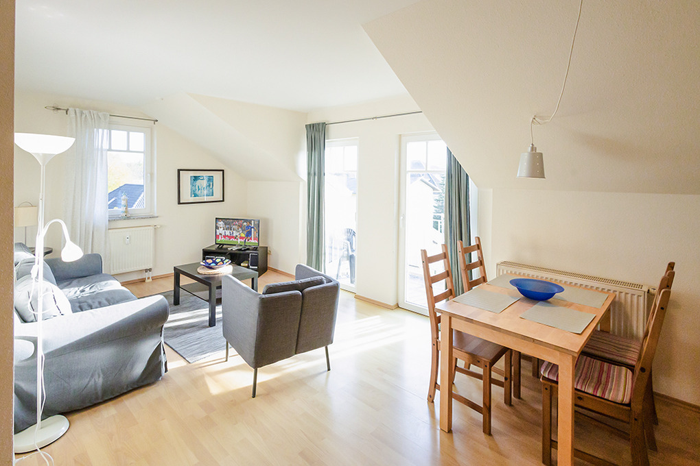 D 17.19 Wohnung 1-4 Pers.: helle, moderne und gemütliche 3-Zimmerwohnung mit 55 qm Wohnfläche, 2. Etage. Schöner Wohn-/Essraum mit Couchgarnitur, Smart-TV, Radio/CD, Esstisch, Einbauküche (Backofen, Spülmaschine). Doppelzimmer. 2-Bettzimmer mit Etagenbett. Bad/WC. Balkon mit Sitzmöbeln (Südlage).