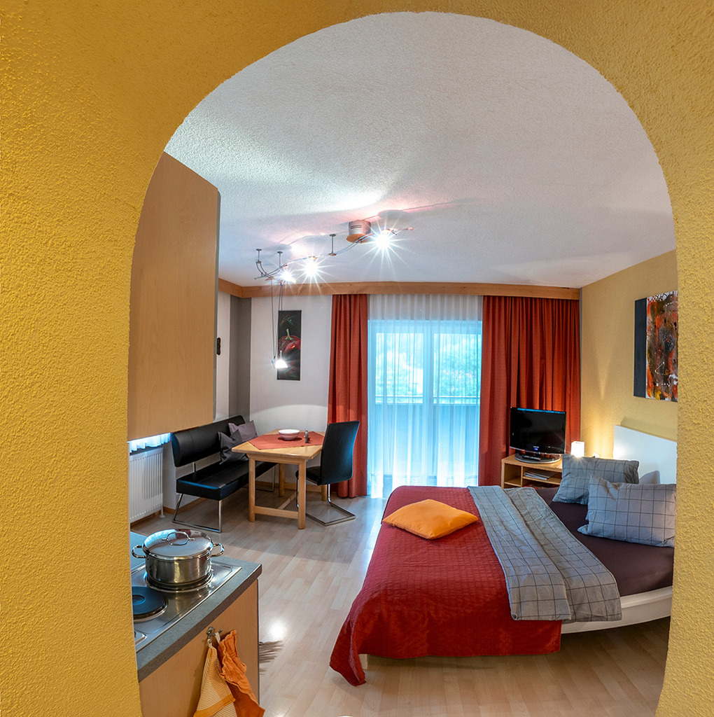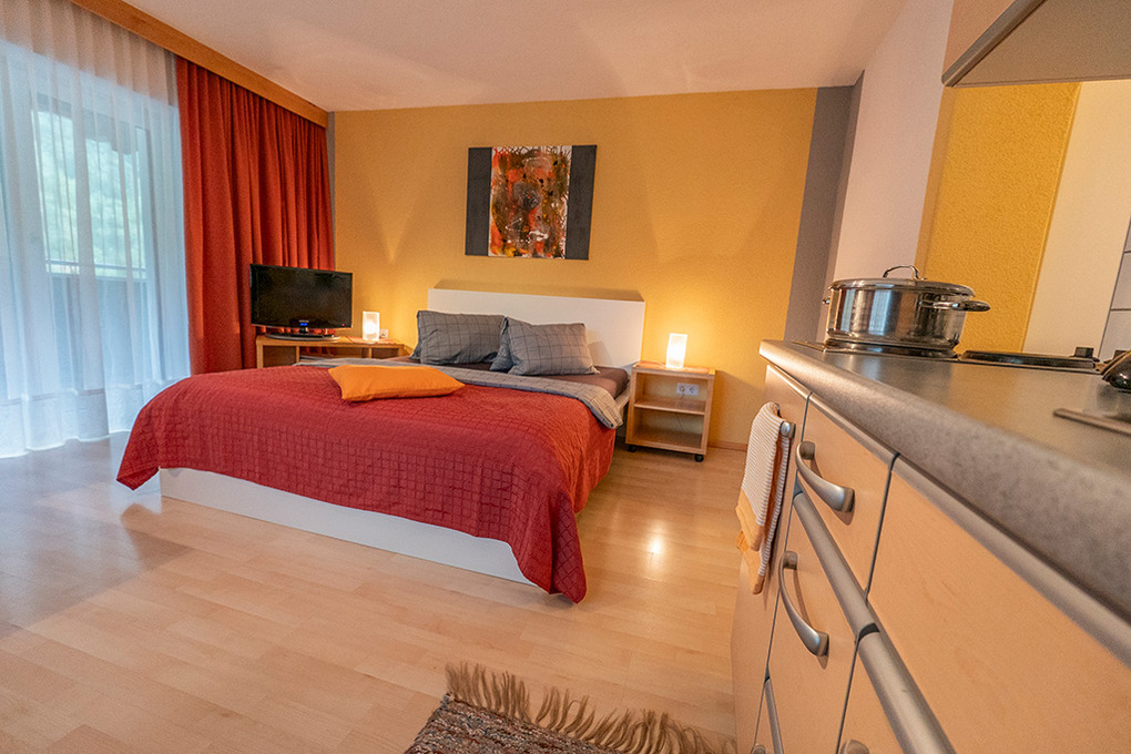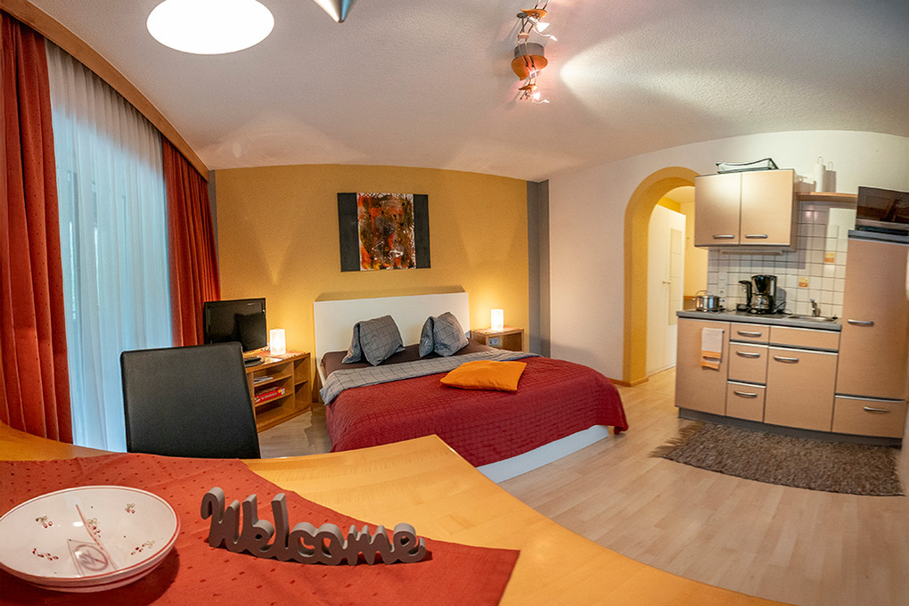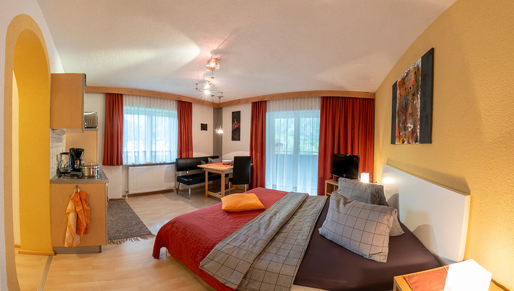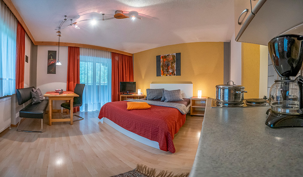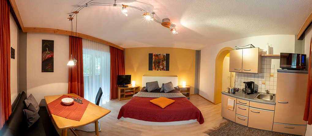A 154.18 Wohnung 1-2 Pers.: Studio mit ca. 30 qm Wohnfläche, 2. Etage. Gemütlicher Wohn-/Schlafraum mit Esstisch, kleiner Küchenzeile (2-Plattenherd, Mikrowelle), Sat-TV, Doppelbett. Bad: Dusche, Waschbecken, WC. Kleiner Vorraum mit Garderobe. Balkon mit Sitzmöbeln und Bergblick.
