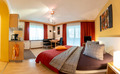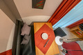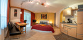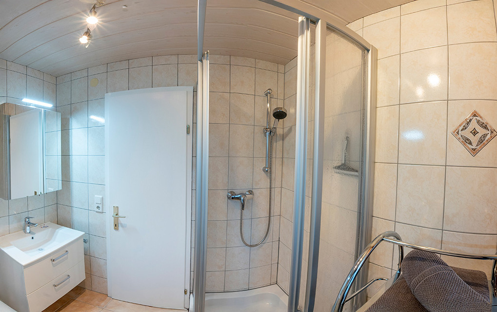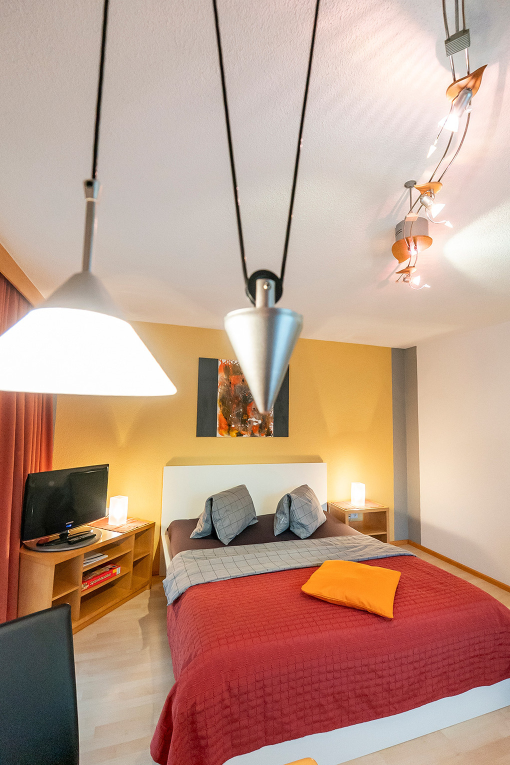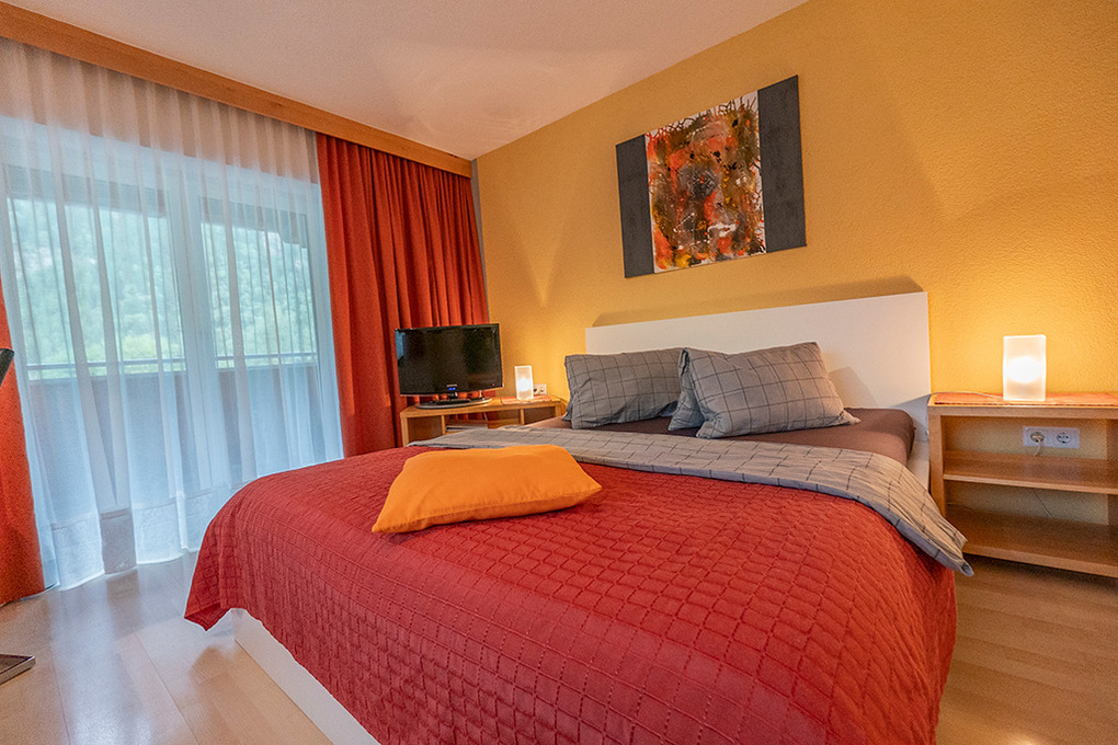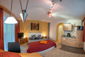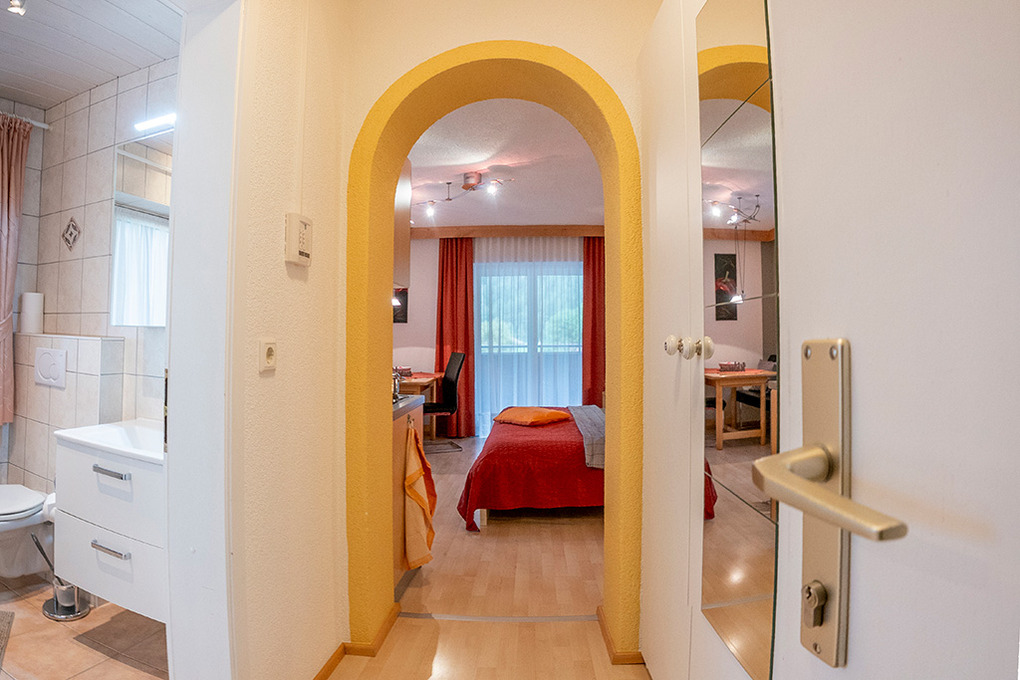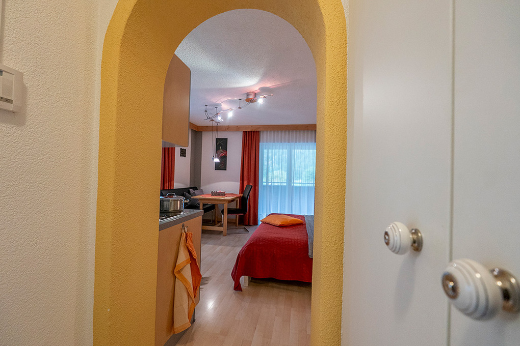 A 154.18 Wohnung 1-2 Pers.: Studio mit ca. 30 qm Wohnfläche, 2. Etage. Gemütlicher Wohn-/Schlafraum mit Esstisch, kleiner Küchenzeile (2-Plattenherd, Mikrowelle), Sat-TV, Doppelbett. Bad: Dusche, Waschbecken, WC. Kleiner Vorraum mit Garderobe. Balkon mit Sitzmöbeln und Bergblick.