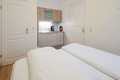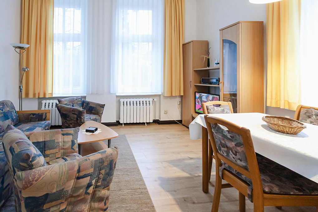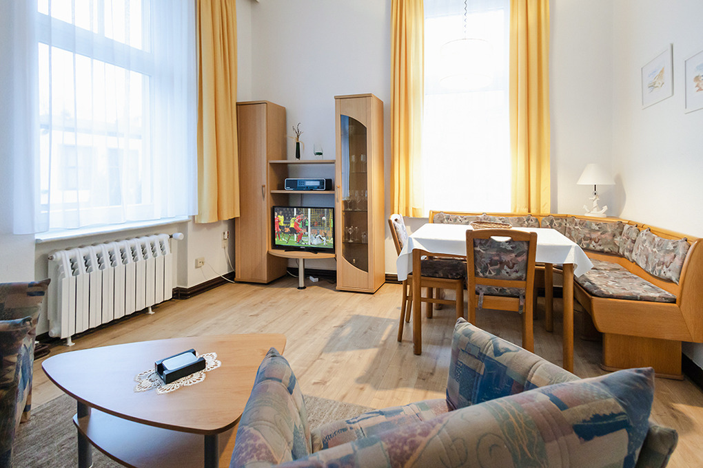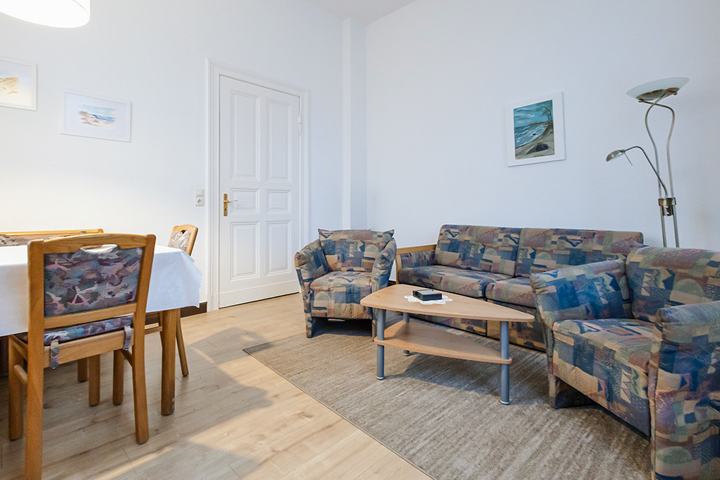 D 12.7 Wohnung 1-3 Pers. : 2-Zimmerwohnung im Parterre mit 38 qm Wohnfläche. Eingangsbereich mit Kleiderschrank. Großer heller Wohn-/Essraum mit gemütlicher Couchgarnitur (Ausziehcouch 2 Pers.), Kabel-TV, Esstisch. Doppelzimmer mit Küchenzeile (2-Platten-Ceranfeld). Modernes Bad: ebenerdige Dusche, Wb, WC. Außensitzplatz mit Bistro-Tisch, Stühlen.