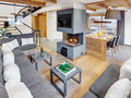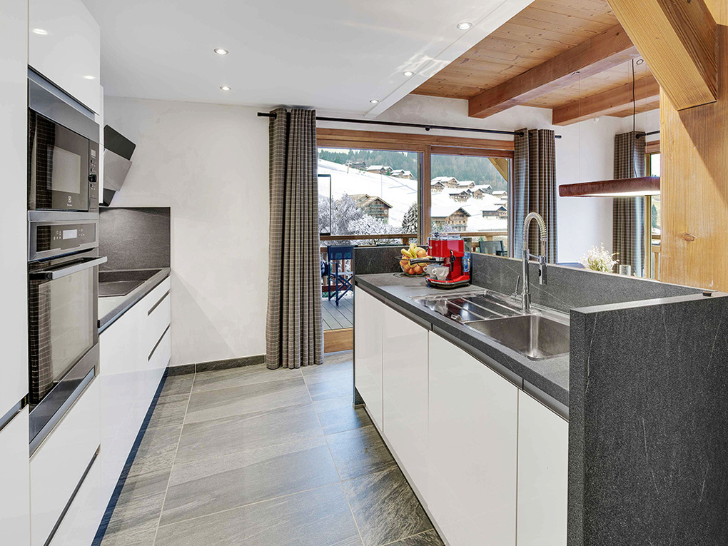 1. Etage: Eingang (Hanglage). Skiraum mit beheizten Schuhtrocknern, Skischrank. Großer Wohn-/Essraum mit gemütlichem Ecksofa, Kaminofen (Holz wird gestellt), Sat-TV, großem Esstisch, moderner, gut ausgestatteter Küchezeile (Backofen, Mikrowelle, Tiefkühlschrank 50 l, Kaffeemaschine, Nespresso-Kaffeemaschine, Raclette-, Fonduegeräte, Geschirrspüler). Separates WC. Große Terrasse mit Whirlpool, Grill und Sitzmöbeln mit herrlichem Blick auf den Mont Lachat und sein Skigebiet.