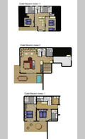 2. Etage mit Schrägen: Doppelzimmer mit Sat-TV, Bad (Whirlpool-Badewanne, Wb). 3-Bettzimmer mit Einzelbetten, Sat-TV. Separates Bad: Dusche, Wb. Separates WC. Offener Schlafraum mit 2 Betten mit Sat-TV, Switchkonsole, Südbalkon.