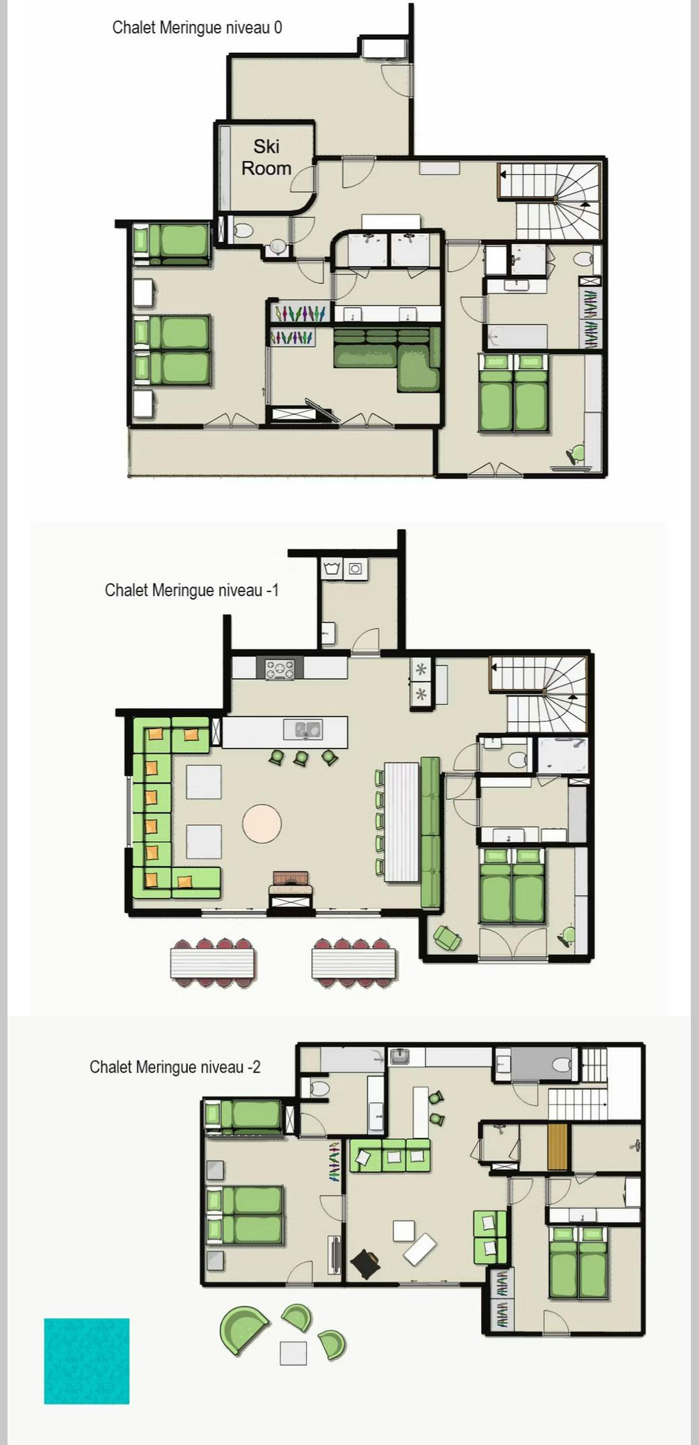 Erdgeschoss: Doppelzimmer mit Sat-TV. Bad (Dusche, Wb). 4-Bettzimmer mit 2 Einzelbetten, Etagenbett, Sat-TV. Separates Bad: Whirlpool-Badewanne, Wb, WC. Spielzimmer mit Smart-TV, Karaoke-Anlage, Tischfußball. Separates WC. Hammam mit Regendusche. Terrasse mit Whirlpool, Hängematte und Liegen.