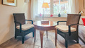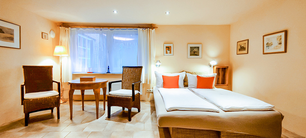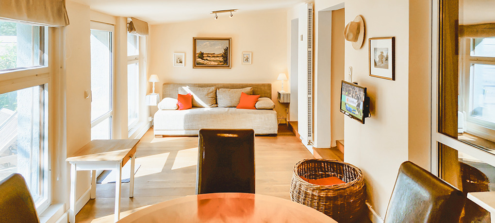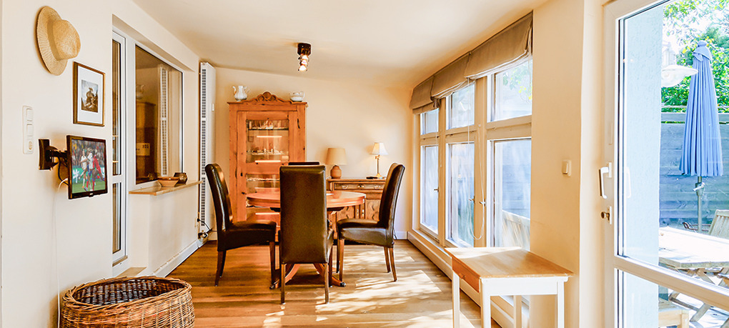 D 53.10 Ferienhaus 2-4 Pers.: 2-Zimmerhaus mit 70 qm Wohnfläche, Parterre: Großzügiger Wohn-/Schlafraum mit Couchgarnitur, Smart-TV, Doppelbett, abgetrenntem Küchenbereich (Backofen, Spülmaschine). Heller Wintergarten mit Couchgarnitur (Schlafsofa 2 Pers.), Esstisch. Großes Bad: Bw, Wb, WC. Schöne Terrasse mit Sitzmöbeln.