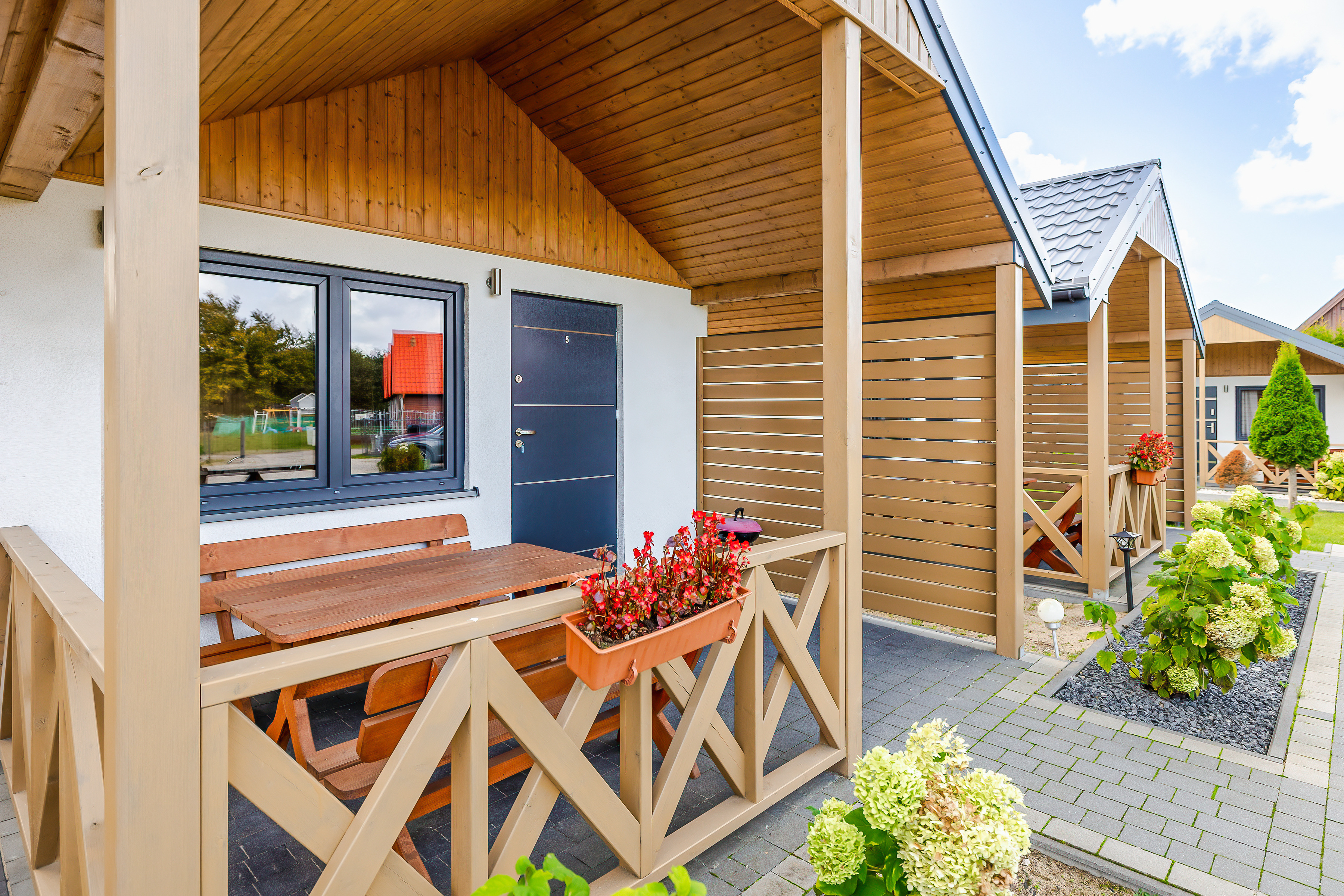 Haus: Sehr gepflegte Ferienhausanlage mit 7 Ferienhäusern auf einem stilvoll angelegtem 2600 qm großen Rasengrundstück, 2021 neu erbaut. In der Anlage: Kinderspielplatz mit Schaukel, Rutsche, kleinem Klettergerüst, Trampolin, Sandkasten. Fahrradverleih (nach Verfügbarkeit, Gebühr).