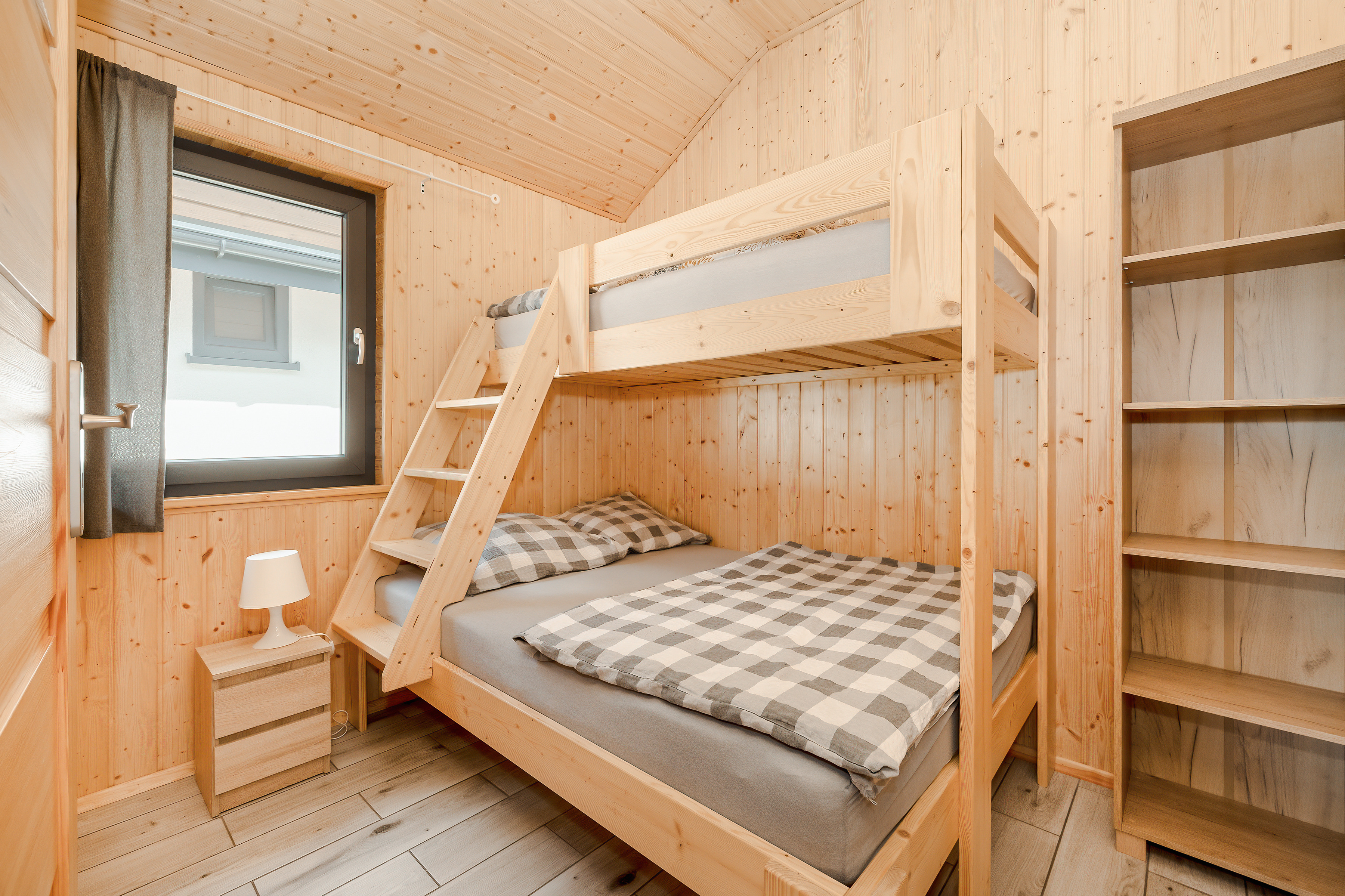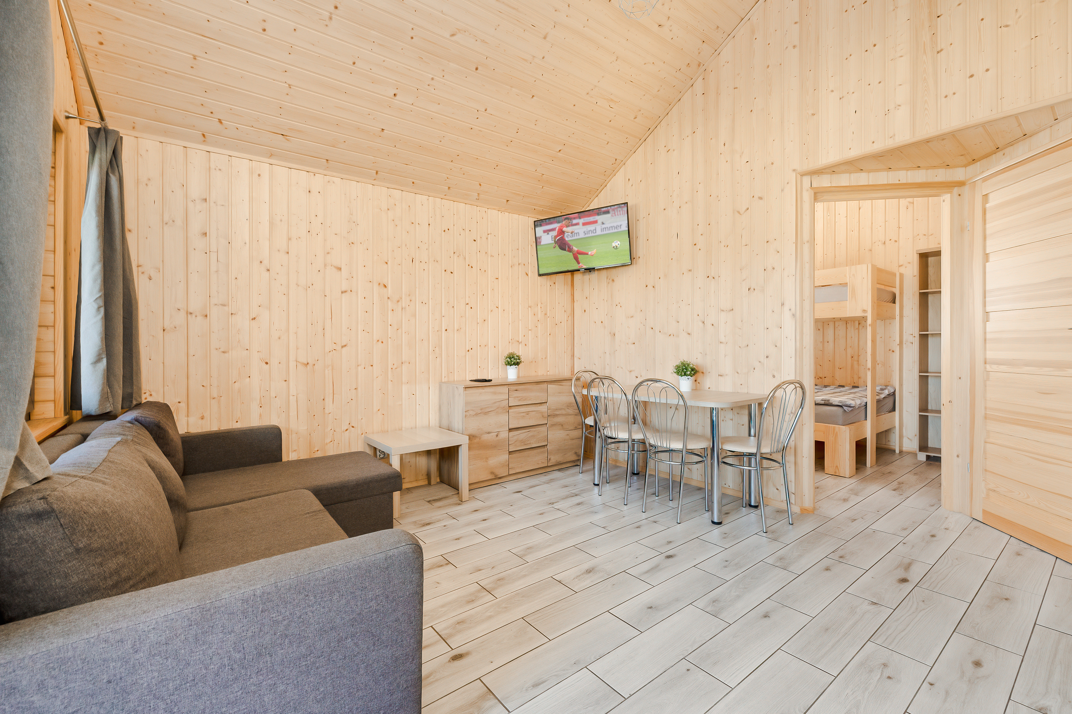 PL 85.16 Ferienhaus 2-5 Pers.: Komfortables 2-Zimmer-Ferienhaus mit 34 qm Wohnfläche. Parterre: Wohn-/Essraum mit Eckcouch (Ausziehcouch 2 Pers.), Flachbild-TV, Esstisch, Küchenzeile (2 E-Platten Induktionsfeld, Abzugshaube, Gefrierfach). Bad: Du, Wb, WC. Dreibettzimmer mit Etagenbett (unten Doppelbett, oben Einzelbett). Große, überdachte Terrasse mit Sitzmöbeln, Grill. Davor schön angelegter Garten und Spielplatz.