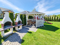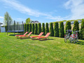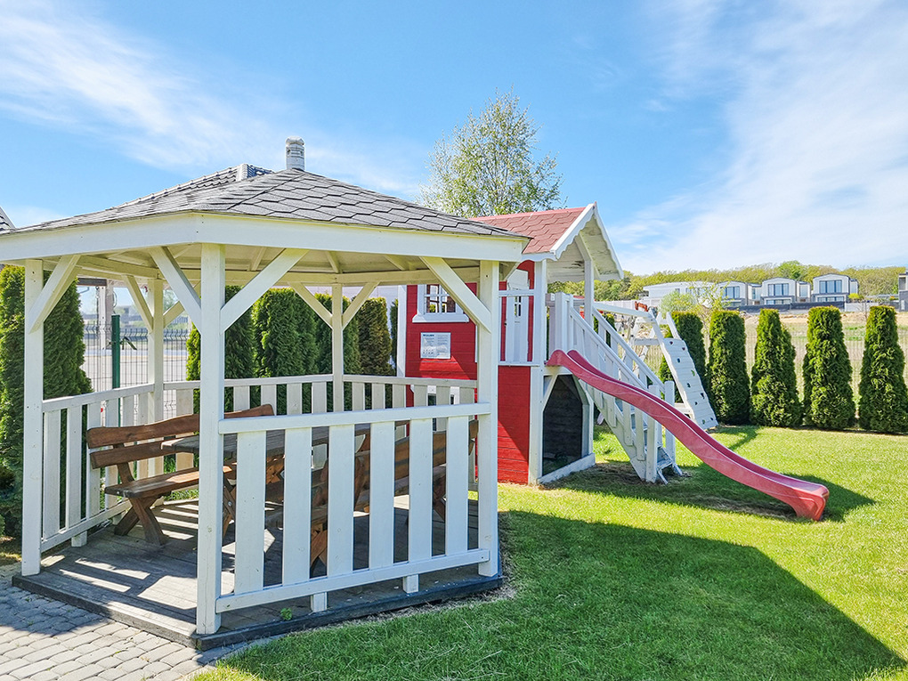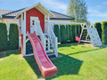 In der Anlage: Kleiner Spielplatz mit Trampolin, Kinderspielhaus mit Rutsche, Schaukel, Sandkasten,