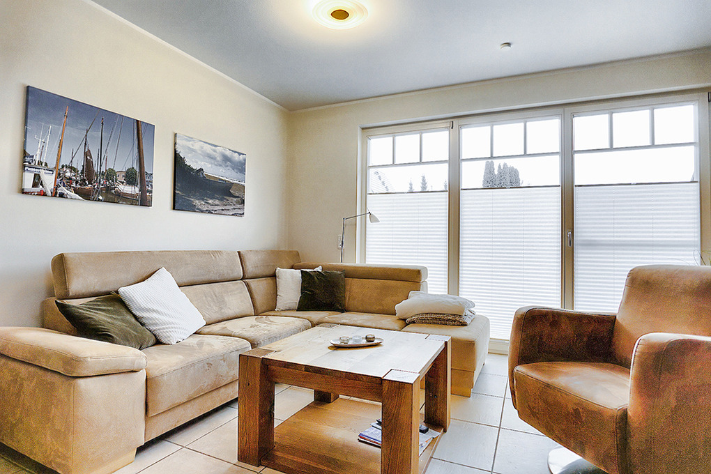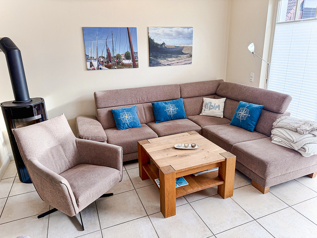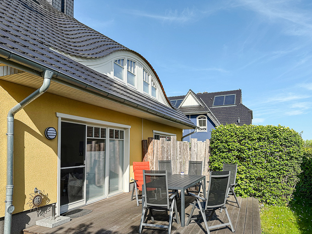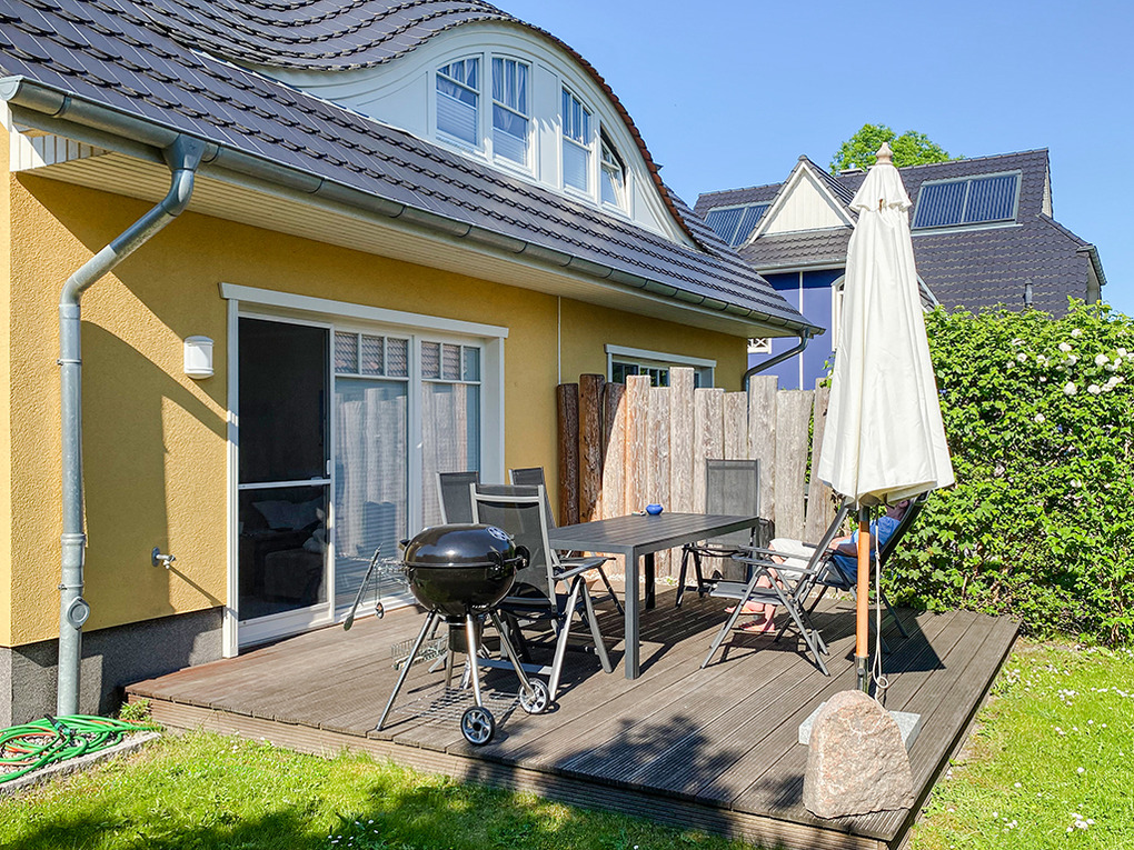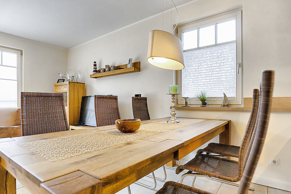 Haus: Komfortable Doppelhaushälfte mit Kaminofen, 3 Schlafzimmern, 2 Bädern. Gehobene Ausstattung mit geschmackvoller Möblierung. Kostenloser Internetanschluss über W-Lan. Zentralheizung (Fußbodenheizung im Parterre und in der 1. Etage, Heizkörper in der 2. Etage). Alle Räume mit Insektenschutzgitter. Süd-Terrasse mit Sitzmöbeln, Sonnenschirm, Grill, anschließend kleiner Garten mit Fahrradschuppen. 2 Pkw-Stellplätze am Haus.