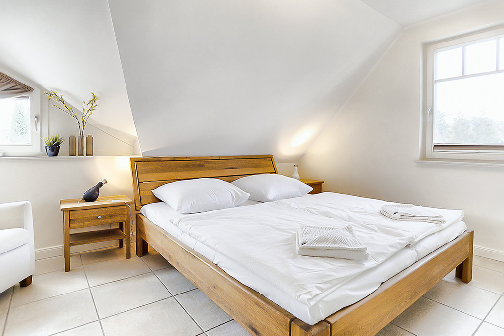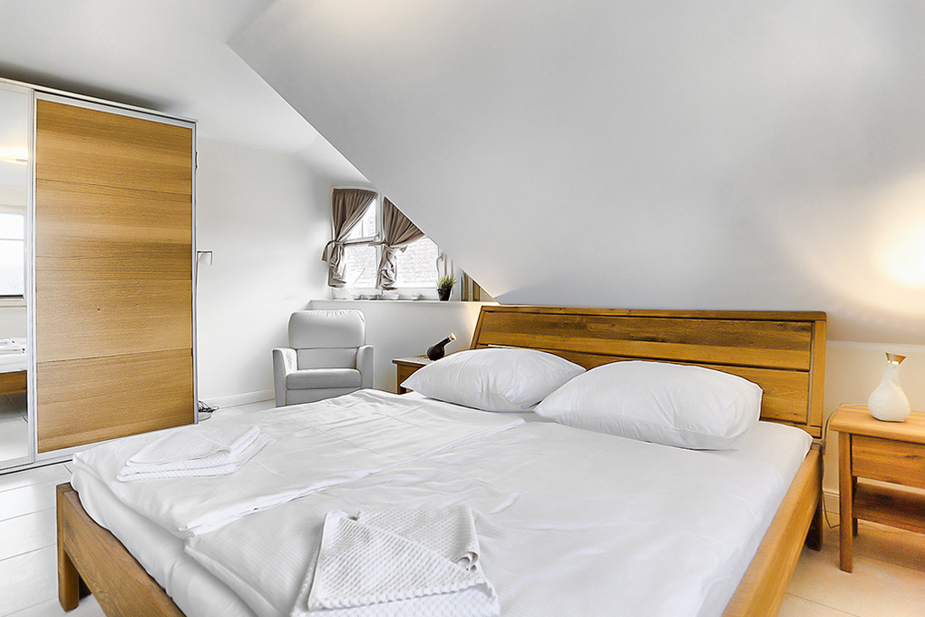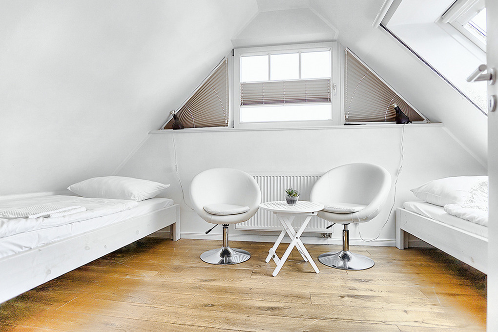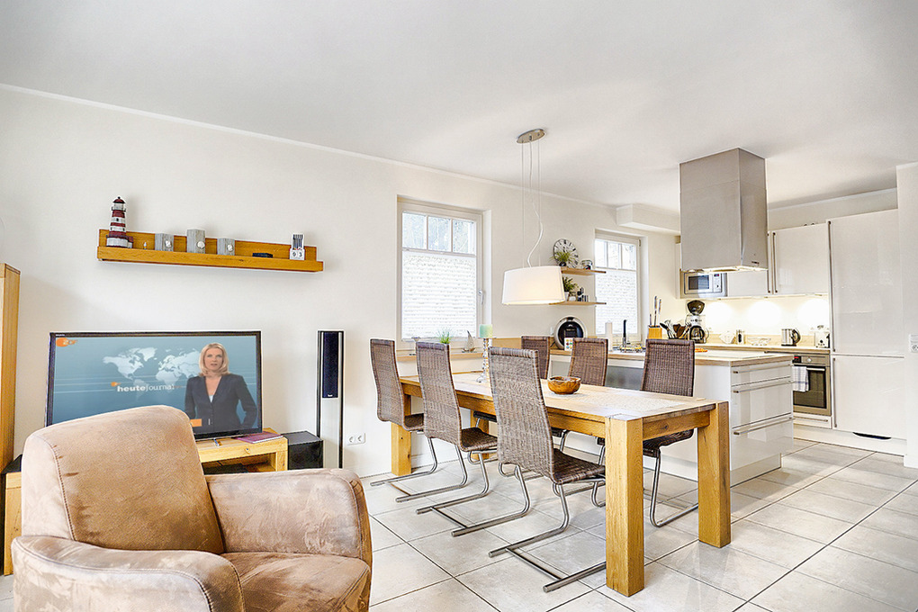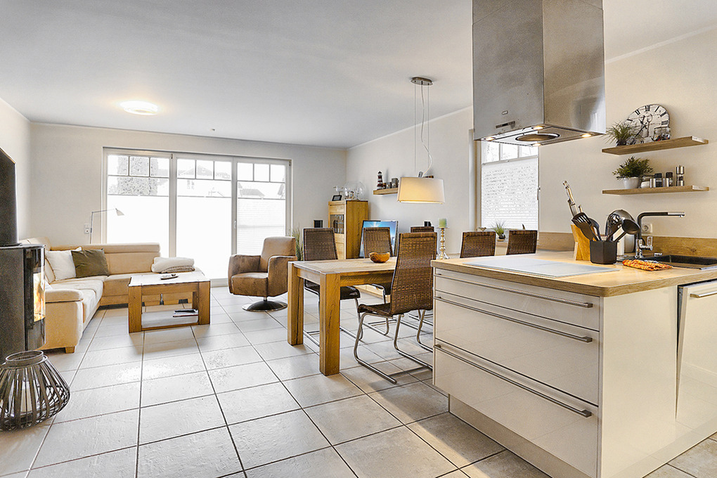 D 67.111 Ferienhaus 1-6 Pers.: Großzügige 4-Zimmerhaushälfte mit 100 qm Wohnfläche über 3 Etagen. Parterre: Heller, freundlicher Wohn-/Essraum mit gemütlicher Couchgarnitur, Kaminofen, Sat-TV (Smart-TV), Audioanlage mit Bluray-Player, Esstisch, moderner, gut ausgestatteter Einbauküche (Backofen, Mikrowelle, Spülmaschine, 2 Kaffeemaschinen für Filter und Kaffeepads) mit separatem Induktionskochfeld. Hauswirtschaftsraum mit Waschmaschine. Bad: Dusche, Waschbecken, WC. 1. Etage: Doppelzimmer mit Sat-TV. Weiteres Doppelzimmer. Großes Bad mit Eckbadewanne, barrierefreier Dusche, Waschbecken, WC. 2. Etage mit Dachschrägen: 2-Bettzimmer mit Sat-TV.