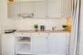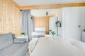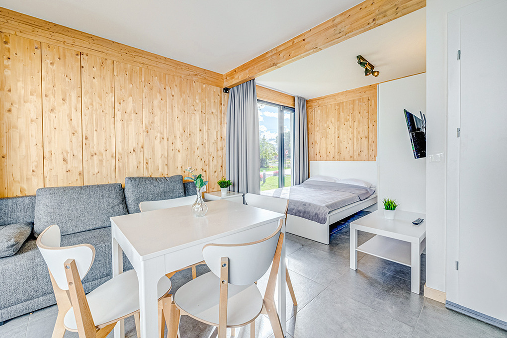 PL 32.12 Ferienhaus 1-4 Pers.: Gemütliches Haus mit 30 qm Wohnfläche. Wohn-/Essraum mit Doppelbett in einer Wohnraum-Nische, durch einen Vorhang vom Wohnraum abtrennbar, Sofa (Ausziecouch 2 Pers.), Flachbild Sat-TV, Esstisch, Küchenzeile (2 Pl. E-Herd, Abzugshaube). Bad: Dusche, Wb, WC. Großzügige Terrasse (15 qm) mit Sitzmöbeln.