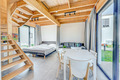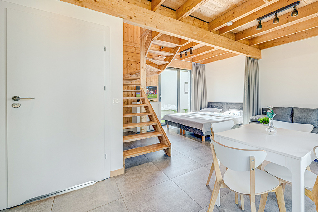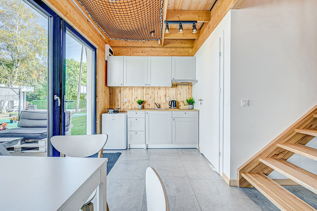 PL 32.13 Ferienhaus 1-6 Pers.: Komfortables Haus mit 50 qm Wohnfläche über 2 Etagen. Parterre: Wohn-/Essraum mit Doppelbett in einer Wohnraum-Nische, durch einen Vorhang vom Wohnraum abtrennbar, Sofa, Flachbild Sat-TV, Esstisch, Küchenzeile (2 Pl. E-Herd, Abzugshaube). Bad: Dusche, Wb, WC. Treppe ins ausgebaute Dachgeschoss: offenes 4-Bettzimmer mit zwei Doppelbetten. Großzügige Terrasse (15 qm) mit Sitzmöbeln.