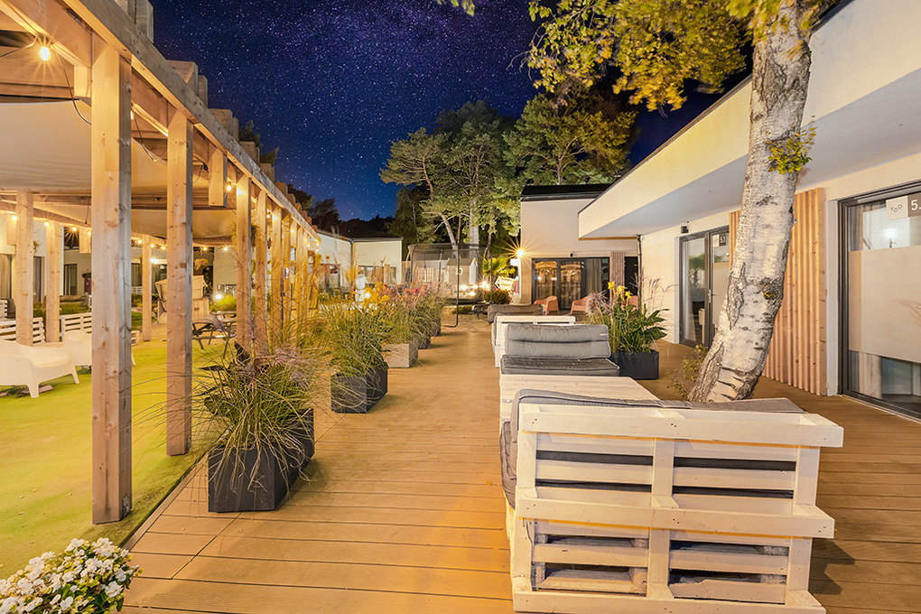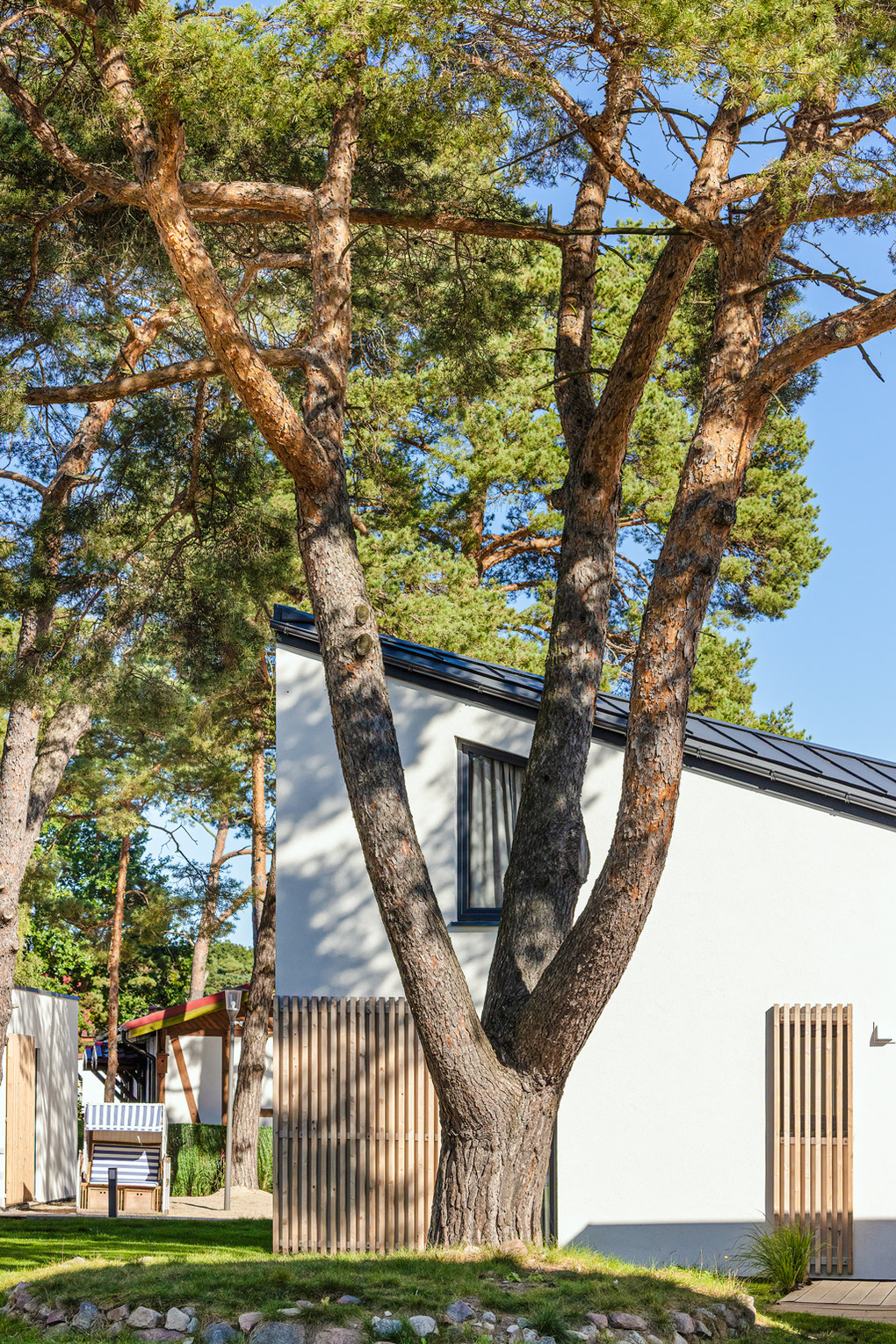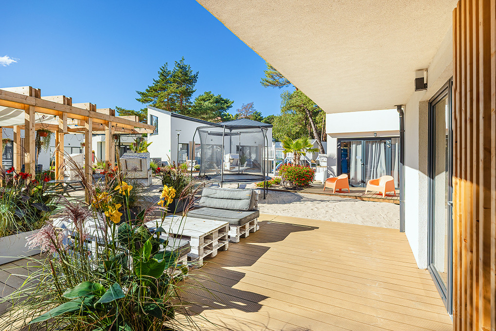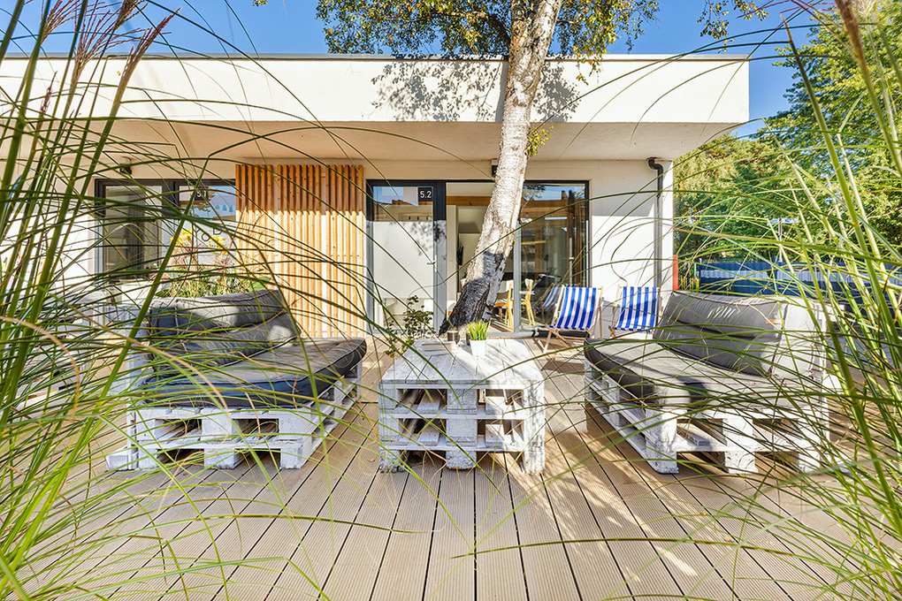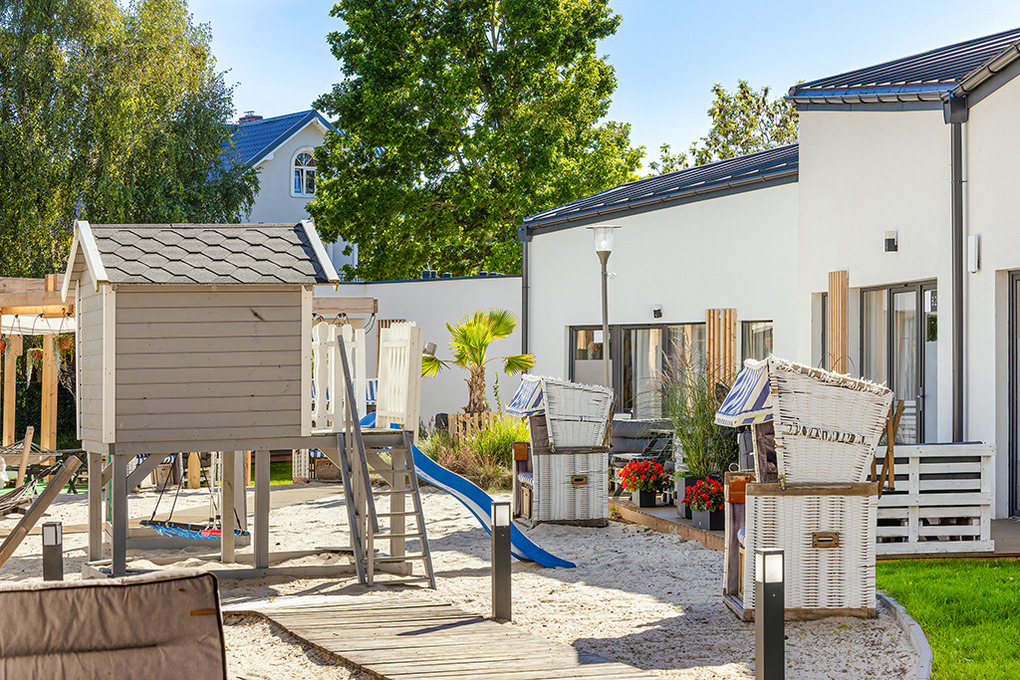 Haus: Kleine, schöne Ferienhausanlage mit modernen Häusern auf einem weitläufigem Rasengrundstück mit lichtem Baumbestand, in 2022 neu erbaut. In der Anlage: Rezeption, Kinderspielplatz mit Klettergerüst, Rutsche, Sandkasten, Trampolin. Gemeinsamer Grillplatz, Fahrradverleih.