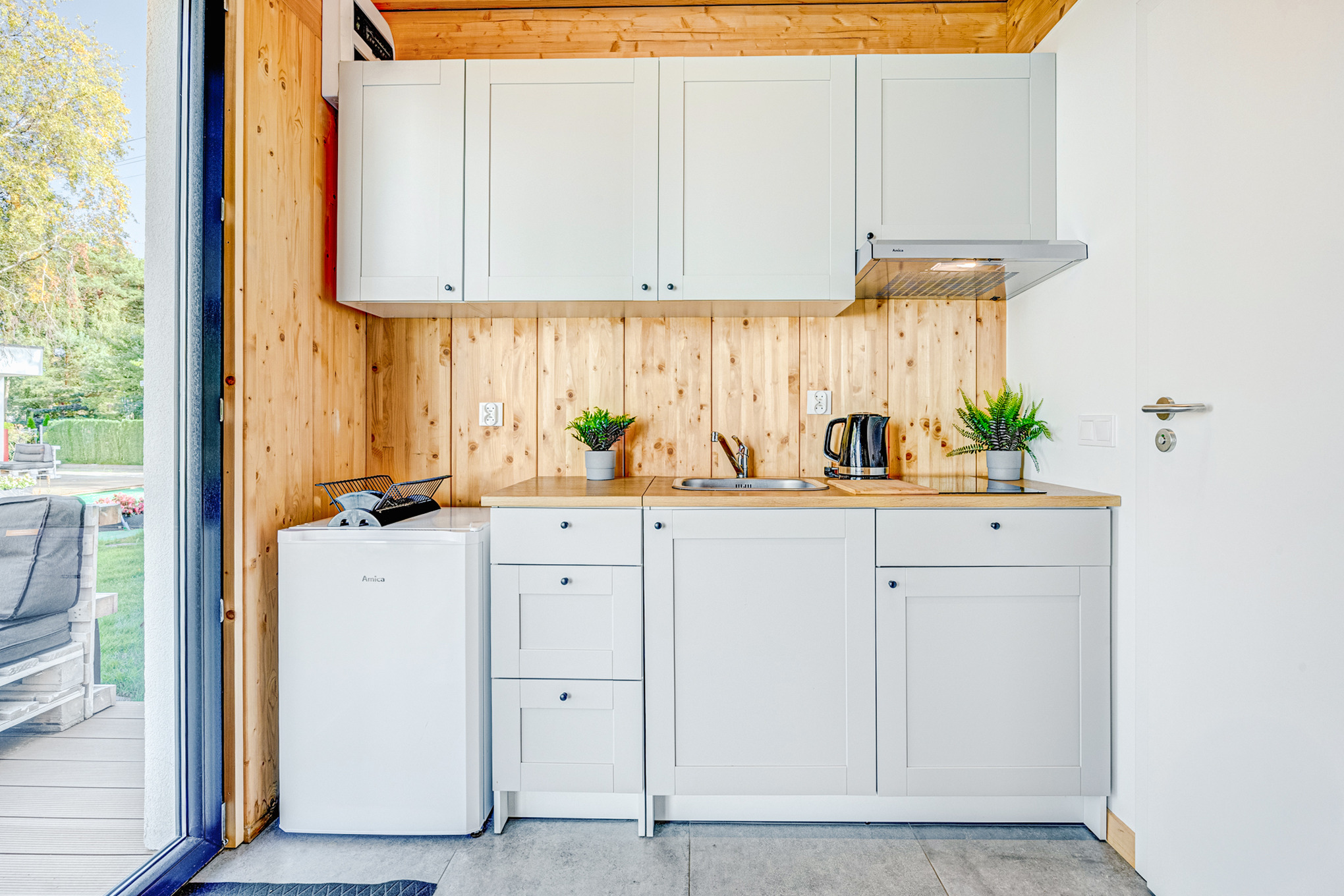 Schöne, komfortable Ferienhäuser mit gemütlicher Einrichtung und großen Terrassen (Sitzmöbel). Alle mit Flachbild Sat-TV (deutsche Programme), kostenlosem Internetzugang über W-Lan. Infrarot-Heizung. Parkplatz auf dem umzäunten Gründstück nach Verfügbarkeit (Gebühr). Weitere Parkplätze auf dem öffentlichen Parkplatz neben der Anlage.