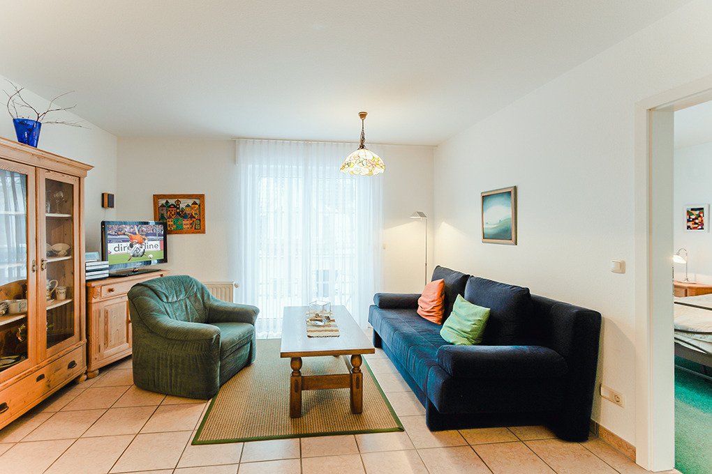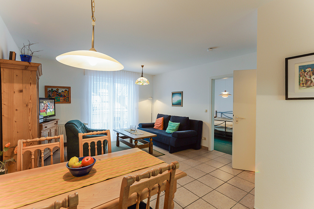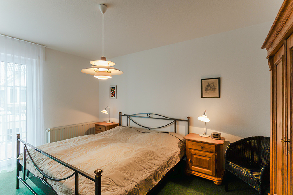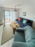 D 67.2318 Wohnung 1-3 Pers.: 2-Zimmerwohnung mit 60 qm Wohnfläche, 1. Etage. Wohn-/Essraum mit gemütlicher Couchgarnitur (Ausziehcouch 1 Pers.), Sat-TV, Esstisch, moderner Küchenzeile (Backofen, Spülmaschine). Doppelzimmer. Bad: Du, Wb, WC, Waschmaschine. Großer Balkon vom Wohnraum und Schlafzimmer zugänglich.
