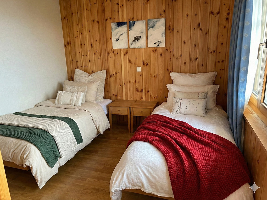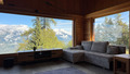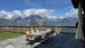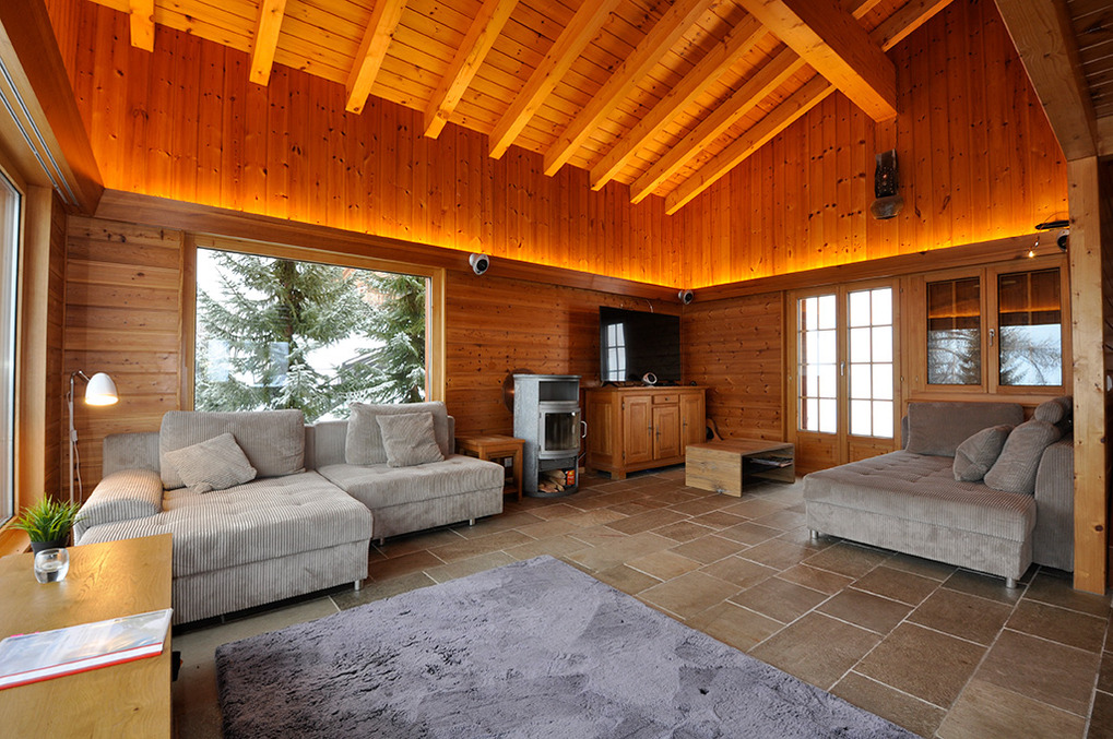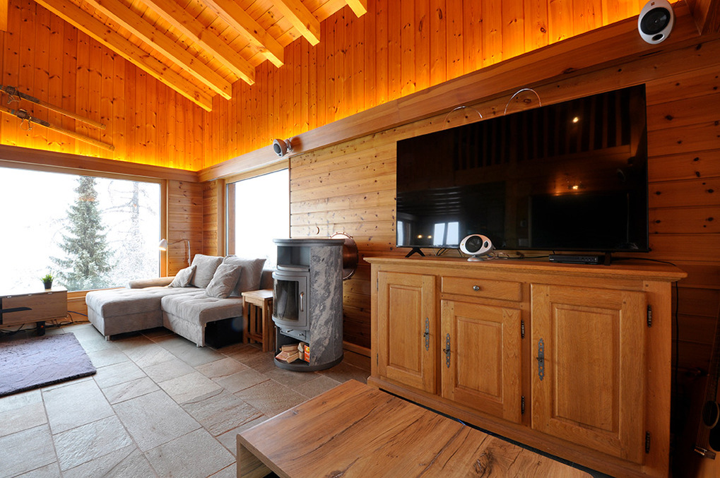1. Etage: Großer, heller Wohnraum (65 qm !) mit Panoramafenstern, Kaminofen, gemütlicher Sofa-Sitzgruppe, Flachbild-Smart-TV, Esstisch, Einbauküche (Backofen, Mikrowelle, Spülmaschine). Große Terrasse mit Sitz- und Liegemöbeln, Trampolin, einzigartigem Bergblick.