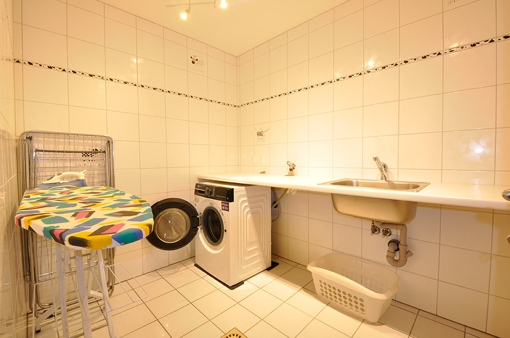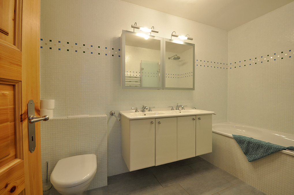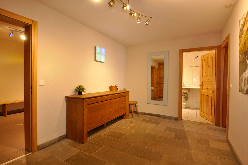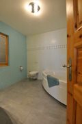 Parterre: Großzügiger Eingangsbereich mit Garderobe. Wohn-/Schlafraum mit gemütlicher Fernseh-Ecke, Smart-TV, Schlafsofa (2 Pers.), Billard. Großes Doppelzimmer mit Bad (Whirlpool-Badewanne, Wb, WC). Doppelzimmer mit Bad (Bw/Du, 2 Wb, WC). 2-Bettzimmer mit Etagenbett. Bad: Du, Wb. Separates WC. Hauswirtschaftsraum mit Waschmaschine, Bügelbrett, Bügeleisen.